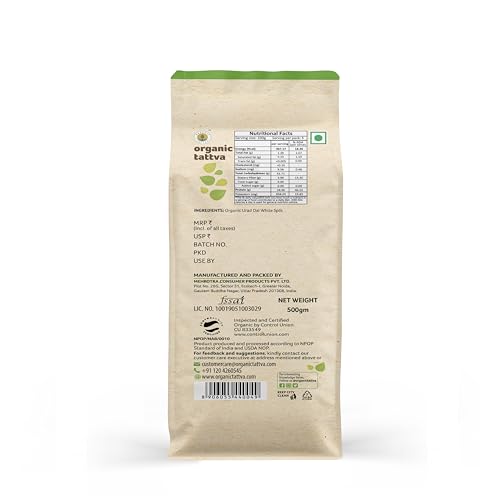 Organic Tattva's Organic Urad Dal White Split is organic certified Vegan Gluten free unpolished and loaded with daily essential nutrients like iron calcium and protein. Along with these nutrients a bowl of Organic Urad White dal also contains dietary fibres sodium and all the other nutrients that are required for your body. Urad Dal split White retains the original texture of dal and is free from pesticides and additives. It is the richest source of Vitamin B and proteins. A 100g serving of Organic Urad Dal Whole White contains 0g trans-fat and 0mg cholesterol. The calorie count per serving of Organic Urad Dal is 304.76. If leading a healthy life is your mantra then switch to Organic Urad White Split unpolished dal by Organic Tattva today! For most Indians comfort food is always linked to easy-to-cook homemade meals and what can be the most convenient and quick to prepare dal. Urad dal can be used to make idlis and dosas. Organic Tattva organic Urad dal is free from additives pesticides and is unpolished as it does not undergo any artificial polishing with water oil or leather thereby retaining its goodness and wholesomeness. The 5-step process ensures that Organic Tattva Urad dal grains are uniform and of premium quality giving you an all-natural authentic taste. So whenever you are in the mood to cook something easy and delicious dive into the scrumptious taste of Organic Tattva pulses and enjoy a lovely meal! Explore Organic Tattva's other organic Pulses range - Toor dal Chana dal Moong dal Moong dal Chilka Green Moong Masoor dal Masoor Whole dal Kali Masoor dal Urad dal Urad Whole dal Urad Kali Kabuli Chana Kala Chana Matki (Moth bean) and Rajma. Storage: Store in a cool and dry place. Transfer contents in an airtight container after opening.