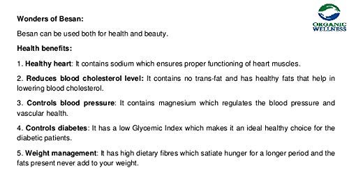 Organic welness besan is organic and rich in fiber and nutrients is made with 100% pure organic chana dal grown in the pollution free lands of bundelkhand. It is found in almost all the indian household and is used to prepare delicious pakoras. Besan can also be used instead of wheat flour in some sauces and gravies as it blends well and imparts a nutty flavor to the dish. This versatile product has many health benefits and is the main ingredients in many of the skin lightening home remedies. It is used to exfoliate and cleanse the skin. It is also used as hair pack. It helps in losing weight and control diabetes. Please check key points for other health benefits of besan