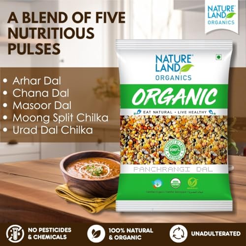 Natureland's mix dal is mixture of five nutritious pulses i. E. Arhar dal chana dal masoor dal moong split chilka and urad dal chilka all these pulses are mixed in a ratio to deliver you a balance of fibre and protein while not compromising with the unmatched taste all the pulses are machine cleaned and handpicked before mixing and packing to ensure its purity and hygiene which is healthier tastier and cooks uniformly.