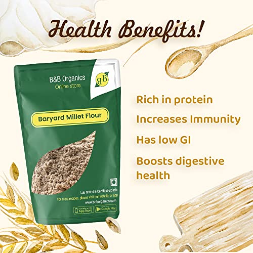 Lab test: B&B Organics procure their products from certified farmers B&B Organics periodically lab test their organic products to maintain its high quality and to prevent contamination.This barnyard millet flour is from the house of B&B Organics. It is organic and has shelf life up to 6 months. It comes in a heat sealed container. Health Benefits (Imprecise) :High in fiber.Good source of zinc and manganese helps to maintain body temperature. It has the lowest carbohydrates content and energy value among all the varieties of millets. Nutritional Value:100gms of barnyard millet has Protein-11.2 gFat-3.9gFiber-10.1gMinerals- 4.4gIron- 15.2 mgCalcium- 11 mgCalories -342 kcal.