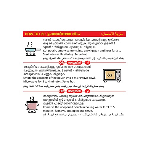 Tasty Nibbles Introducing Ready to Eat Cooked Matta rice prepared from premium quality brown rice. This brings clean fresh tasty and traditional Kerala meals ready in 5 min. It is Ready-to-Eat so can be consumed straight from the pack or warmed up. No Food additives added Heat & Eat. Japanese RETORT Technology. Net weight 1kg (250g x 4) Shelf life 18 months at room temperature HOW TO USE: Cut pouch empty contents into a frying pan and heat for 3 to 5 minutes while stirring. Serve hot. (OR) Empty the contents of the pouch into a microwave bowl. Microwave for 3 to 4 minutes. Serve hot. (OR) Immerse the unopened pouch in boiling water for 3 to 5 minutes. Remove cut open and serve. Once opened consume immediately. This product is ready-to-eat form can be consumed straight out of the pack or warmed up as above. Store in a cool and dry place.