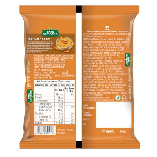 For most Indians comfort food is always linked to easy-to-cook homemade meals and what can be more convenient and quick than preparing a hearty dal meal? Essential in every household Tata Sampann dals are unpolished and do not undergo any artificial polishing with water oil or leather thereby retaining their goodness and wholesome character. The 5-step process ensures that Tata Sampann grains are uniform and of premium quality giving you an all-natural authentic taste. A staple in the Indian diet Toor Dal provides nutrients such as Protein & Fibre. Made of select grains and recommended by Chef Sanjeev Kapoor and Chef Ranveer Brar Tata Sampann Unpolished Toor Dal makes for a delicious meal choice. So whenever you are in the mood to cook something easy and delicious dive into the scrumptious taste of Tata Sampann pulses and enjoy a lovely meal! Explore Tata Sampann Pulses range âKabuli Chana Chana dal Moong dal Moong dal Chilka Green Moong Masoor dal Masoor Small dal Masoor Whole dal Kali Masoor dal Urad dal Urad Whole dal Urad Kali Kala Chana and Rajma. Storage Instructions: Store in a cool and dry place. Transfer contents to an airtight container after opening.