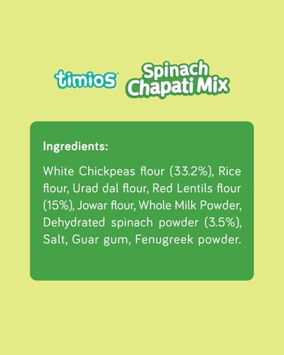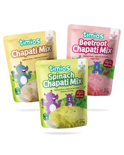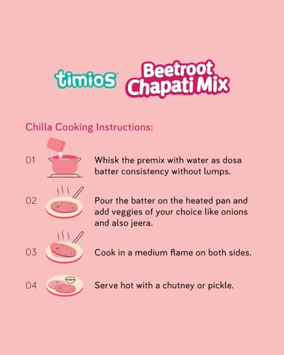 Timios spinach chapati mix can be a good source of nutrients fiber and health benefits. It includes Spinach which helps to boost brain health and has a high level of antioxidants folate and phylloquinone (a form of vitamin K found in leafy greens) that help to protect brain cells. It is rich in fiber folic acid and potassium all of which are found in abundance and promote heart health. It contains ingredients such as White Chickpeas flour Rice flour Urad dal flour Red lentil flour Jowar flour and Whole milk powder which are good sources of protein and plentiful sources of fiber folic acid and potassium Lentils help to lower cholesterol contain folates which are necessary for the synthesis of DNA and other genetic material. In just a few minutes you'll be rewarded with a mouth-watering chapati or chilla that will impress your taste buds and those of your loved ones. Perfect for daily breakfast dinner lunch and special occasions Timios Beetroot chapati mix can be a good source of nutrients fiber and health benefits. It includes beetroot which helps to boost brain health and reaction time and has high levels of antioxidants folate(vitamin B9) manganese potassium iron and vitamin C. It is associated with numerous health benefits including improved blood flow lower blood pressure and increased exercise performance. Timios chapati mix can be a good source of nutrients fiber and health benefits. It includes ingredient which helps to boost brain health and has a high level of antioxidants folate and phylloquinone (a form of vitamin K found in leafy greens) that help to protect brain cells. It is rich in fiber folic acid and potassium all of which are found in abundance and promote heart health. It contains ingredients such as White Chickpeas flour Rice flour Urad dal flour Red lentil flour Jowar flour and Whole milk powder which are good sources of protein and plentiful sources of fiber folic acid and potassium Lentils help to lower cholesterol contain folates which are necessary for the synthesis of DNA and other genetic material.