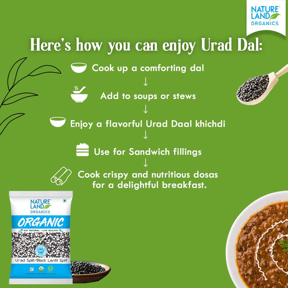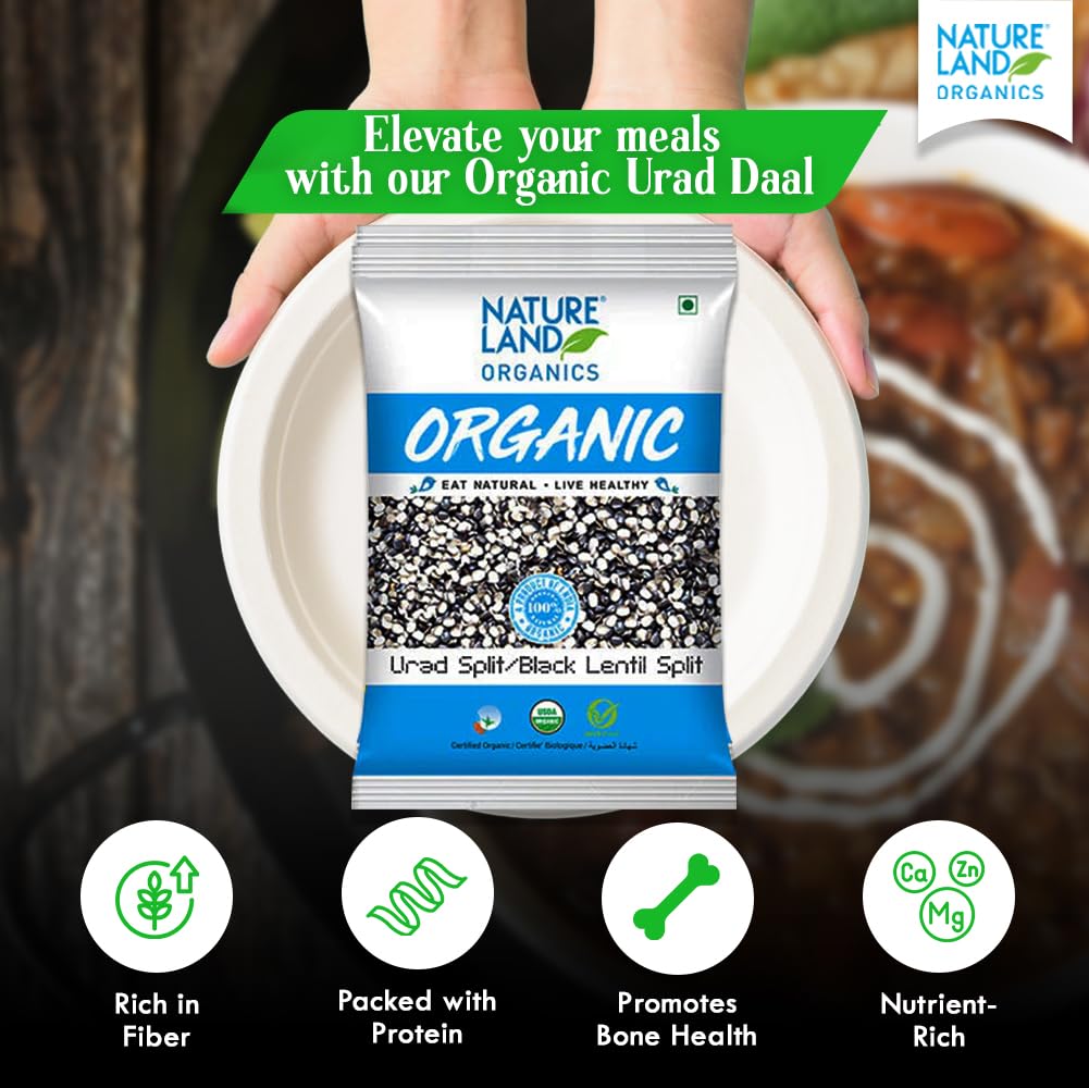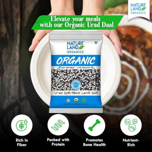 Nature land organic foods urad split chilka is processed from organic urad whole by splitting the whole urad bean in two parts whereas the outer skin remains on the bean making it rich in dietary fibres. It is machine cleaned and handpicked before packing to ensure its purity and hygiene which is healthier tastier and cooks uniformly.