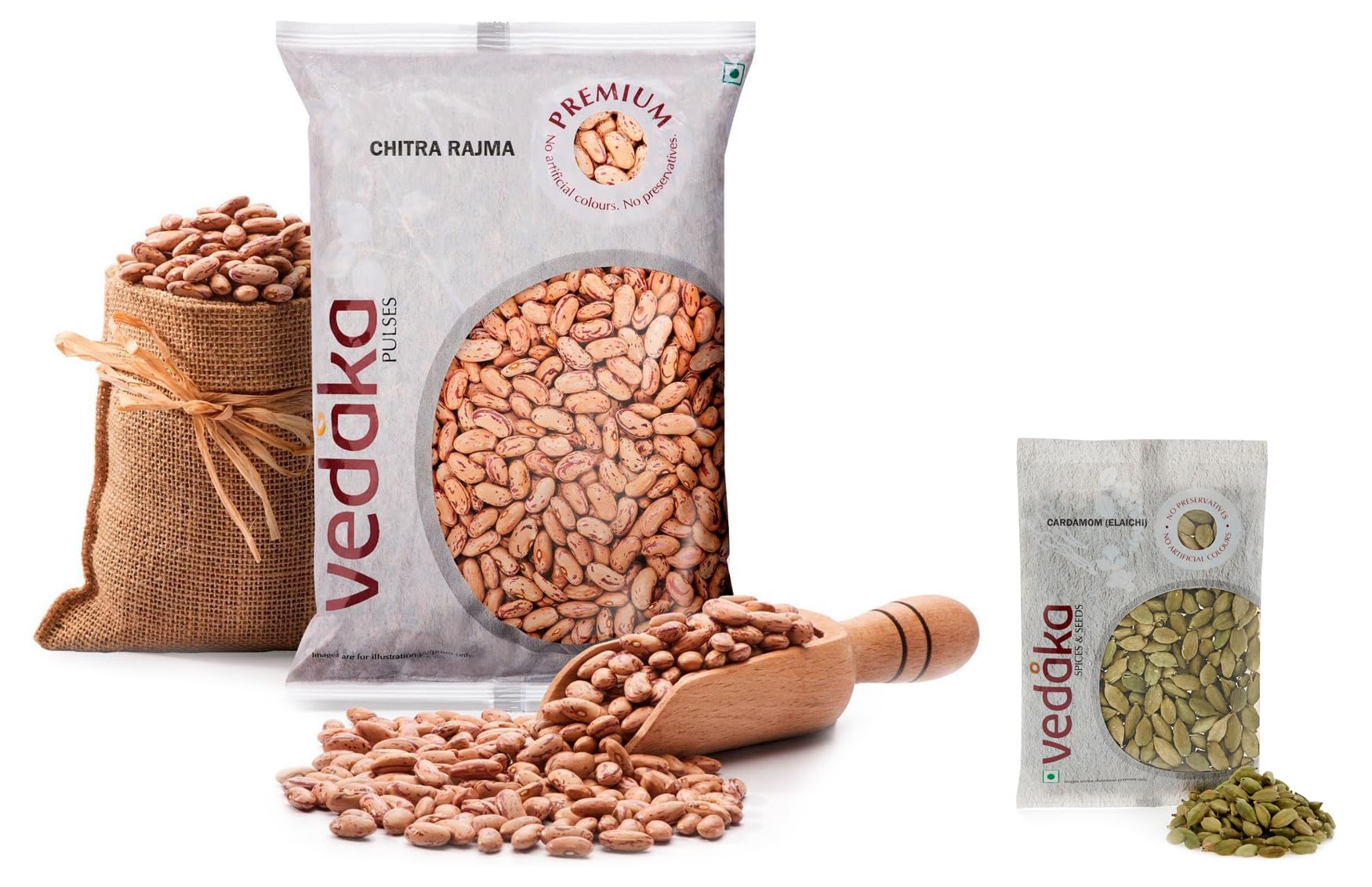 Vedaka Premium Chitra Rajma 1 kg |Rich in Protein|No Cholesterol|No AdditivesAll vedaka pulses are hygienically packed and undergo rigorous laboratory tests to meet stringent food safety norms.Vedaka Whole Cardamom (Elaichi) 100gAll Vedaka spices & seeds are hygienically packed and undergo stringent and rigorous laboratory tests to meet FSSAI food safety norms No artificial colours and preservatives.