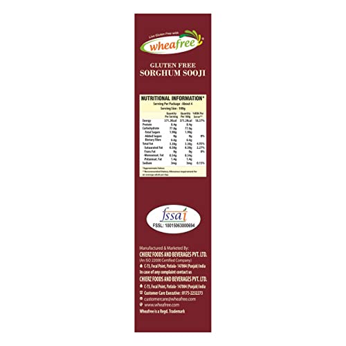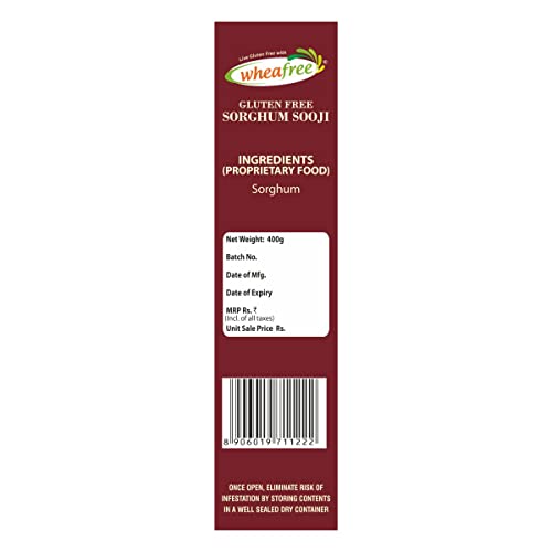 HomeGroceryCookingOrganic Flours, Rice & PulsesWheafree Gluten Free Sorghum Sooji (Pack of 2 x 400g Each) | Rich in Vitamins Iron Minerals & Micronutrients | Rich in Fiber and Protein | Diabetic Friendly