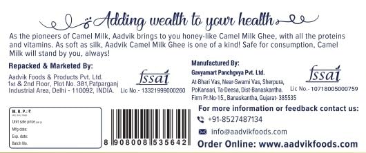 Ghee is the pride of India and with it we at Aadvik Foods bring to you the purest of Camel Milk Ghee. Aadvik Camel Milk Ghee has a smooth texture and a natural aroma which is hard to miss. Aadvik does not add any preservatives or additives to its Camel Milk Ghee. Wondering what real Camel Milk Ghee tastes like? Well youâll find your answer in the form of Aadvik Camel Milk Ghee. Add Aadvik Camel Milk Ghee to your diet today!