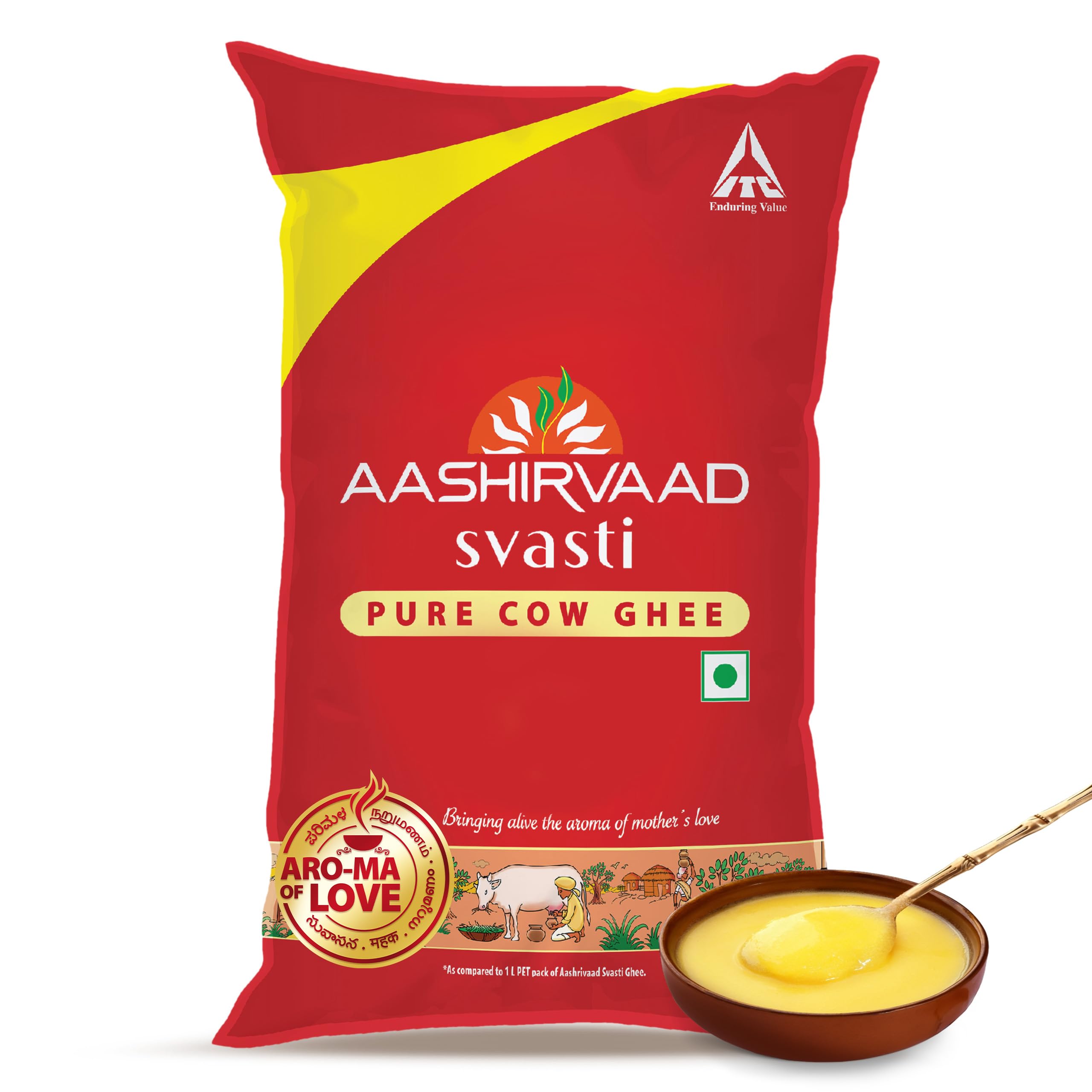 Aashirvaad Svasti pure cow ghee is made with a special slocook process. In this process the ghee is prepared by cooking slowly for about three and a half hours over gradually increased temperatures which enhances its natural aroma. Enjoy this desi ghee which has a rich aroma golden granular texture and consistent quality.