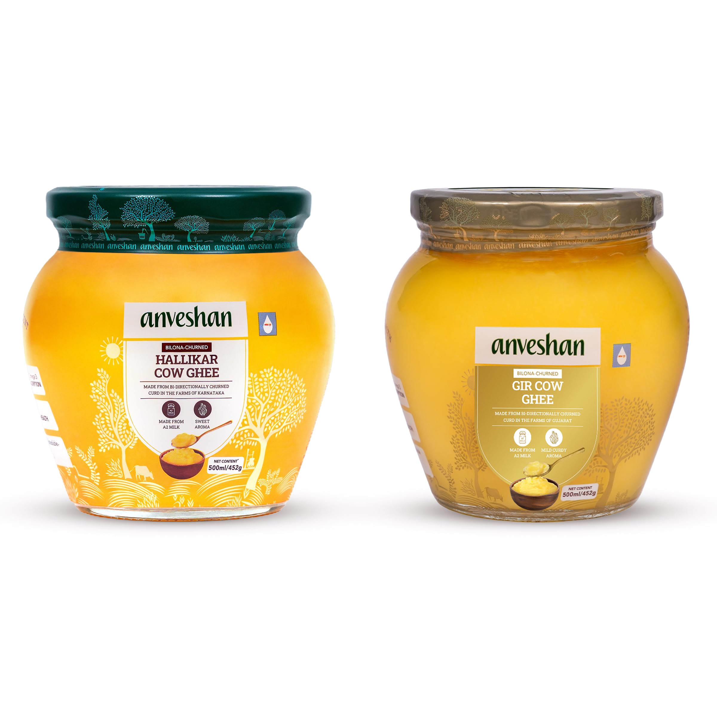 Introducing our combo of premium ghee varieties to elevate your culinary experience. Indulge in the richness of our bilona churned ghee meticulously crafted from the A2 milk of grass-fed Hallikar cows in Tamil Nadu and Gir cows in Gujarat. Experience pure natural ghee without compromising on quality. Each batch undergoes rigorous lab testing ensuring its purity and quality before being presented in food-grade glass jars. Experience the perfect combination of flavor tradition and health benefits with our premium ghee combo.