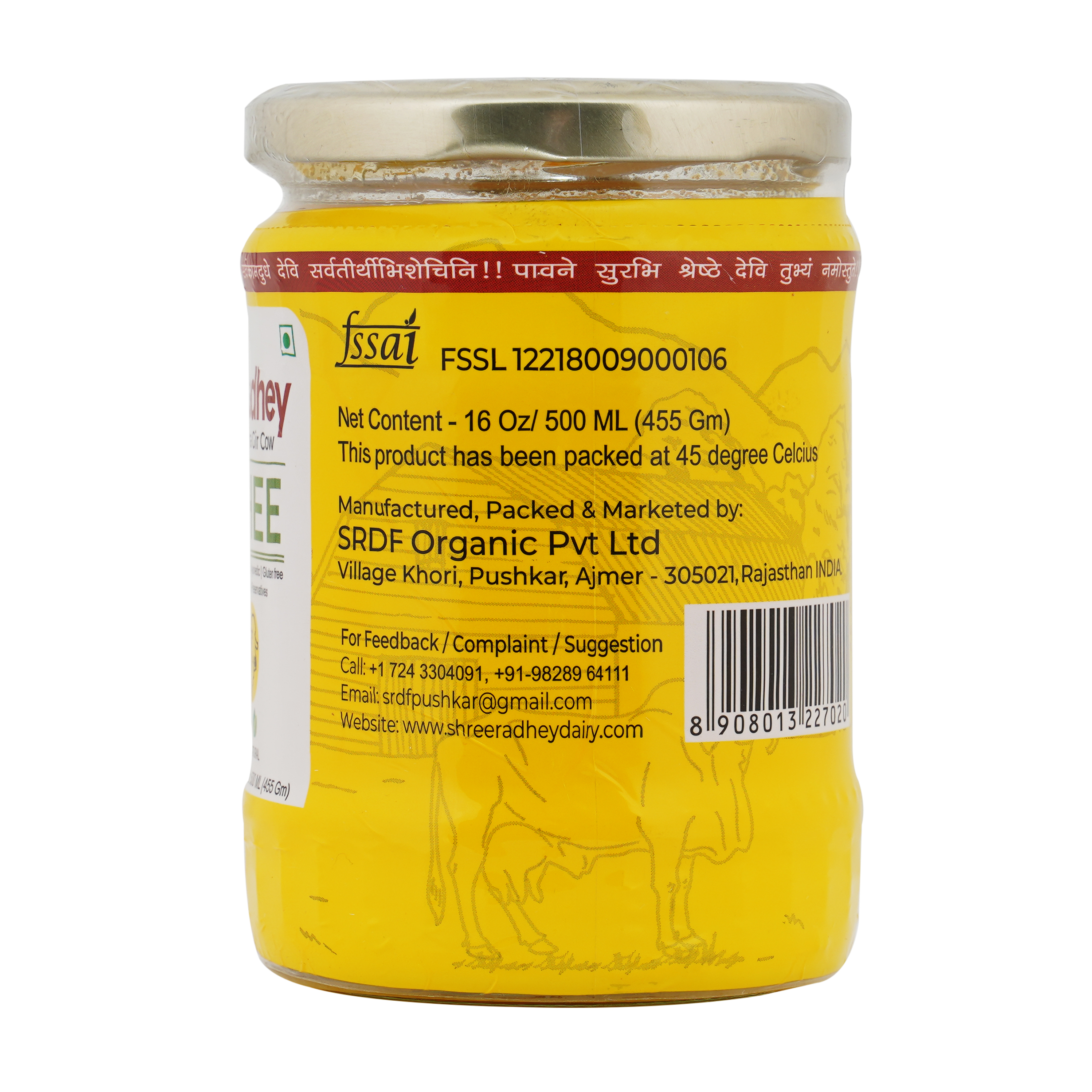 Shree Radhey A2 Gir Cow Ghee is one of the most trusted product because of it's quality taste and value for money attributes. Best source of nutrition for you and your family as it tastes what real ghee should taste like. Tip: Ghee must always be consumed with hot items specially liquids like daal kadhi milk etc. Cooking food in ghee makes it tastier as well as healthy ! Our Process is completely based on ancient Indian traditions. We use hand-churrn techniques to get the purest and finest ghee; in our procedure we use 30 litres A2 milk into curd which is coalesced and hand-churned to finally produce 1 litre of Vedic Ghee. Step 1 : In a clay pot unprocessed fresh and raw milk is boiled and converted into curd Step 2 : Hand-churned process is used with a wooden churner also known as Bilona in Indian language Step 3 : We obtain the butter in this process then separate it. Step 4 : Separated butter (makkhan) is then boiled in an iron vessel on sim fire.