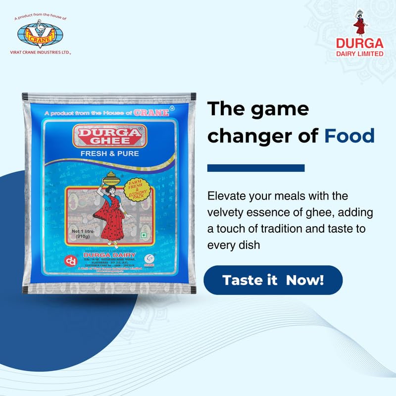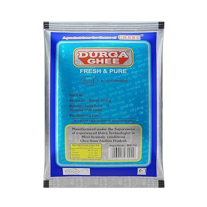 Durga Ghee Pouch, 500 ml, 1 LExperience the purity of Durga Ghee, a premium clarified butter made with time-tested processes. Durga Ghee, made from the best milk, has a deep, nutty scent that improves the flavor of your favorite recipes.About The Product:Made from 100% pure milk (cow or buffalo, depending on the kind you pick).Traditionally prepared for outstanding flavor and texture.High in Vitamin A to promote healthy vision.A high smoke point is appropriate for many cooking methods, from sautéing to deep frying.pouch packing is convenient for storage and use.Suitable for vegansIngredients:Ghee (clarified butter) made from cow or buffalo milkBenefits:It improves the flavor of your foods with its rich, buttery taste.It promotes good digestion since it is easy to absorb.An excellent source of healthy fats for prolonged energy.Lactose and casein-free, making it appropriate for individuals with dairy allergies.Shelf-stable with an extended storage lifeDirections:Add Durga Ghee to dals, curries, veggies, or rice for a taste boost.Because of its high smoke point, it is ideal for sautéing, shallow frying, and deep frying.You may also try a teaspoon of Durga Ghee for a taste of pure goodness.About The Brand:Durga Ghee is a product of Durga Dairy Limited, a brand noted for its dedication to quality and traditions. They employ time-tested procedures and the best ingredients to make pure, genuine ghee for your cooking requirements.Durga Ghee Pouch FAQ's:1. What's the distinction between cow and buffalo milk ghee? Both have a rich flavor, but buffalo milk ghee has a little greater fat content and creamier consistency.2. How long ca