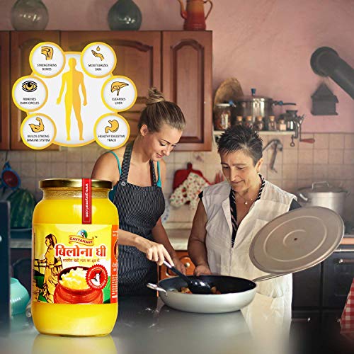 This Gavyamart Vedic Bilona Ghee Prepared by Shree Nandanvan Godham Mahatirth where they Capet only Indian breed cows like kankrej Sanchori and Gir cows only. Milking is done by hands after feeding calf properly. It is prepared by traditional Indian method where we use A2 cow milk for making cured. Then the Curd is hand churned(bi-directional) to extract butter in earthen pot. obtained Butter is slowly heated to extract Gavyamart Bilona Ghee is prepared by the traditional bilona churned method. You obtain desi ghee from curd route. Where you first obtain milk from desi cow's only 70% of milk is obtained and 30% left for the calf. Then you boil milk in earthen pots and keep the milk overnight to make curd out of it. Once you have curd you need to make butter out of curd and then this butter got boiled to evaporate water from ghee and the fat (clarified butter) is separated from the milk solids.