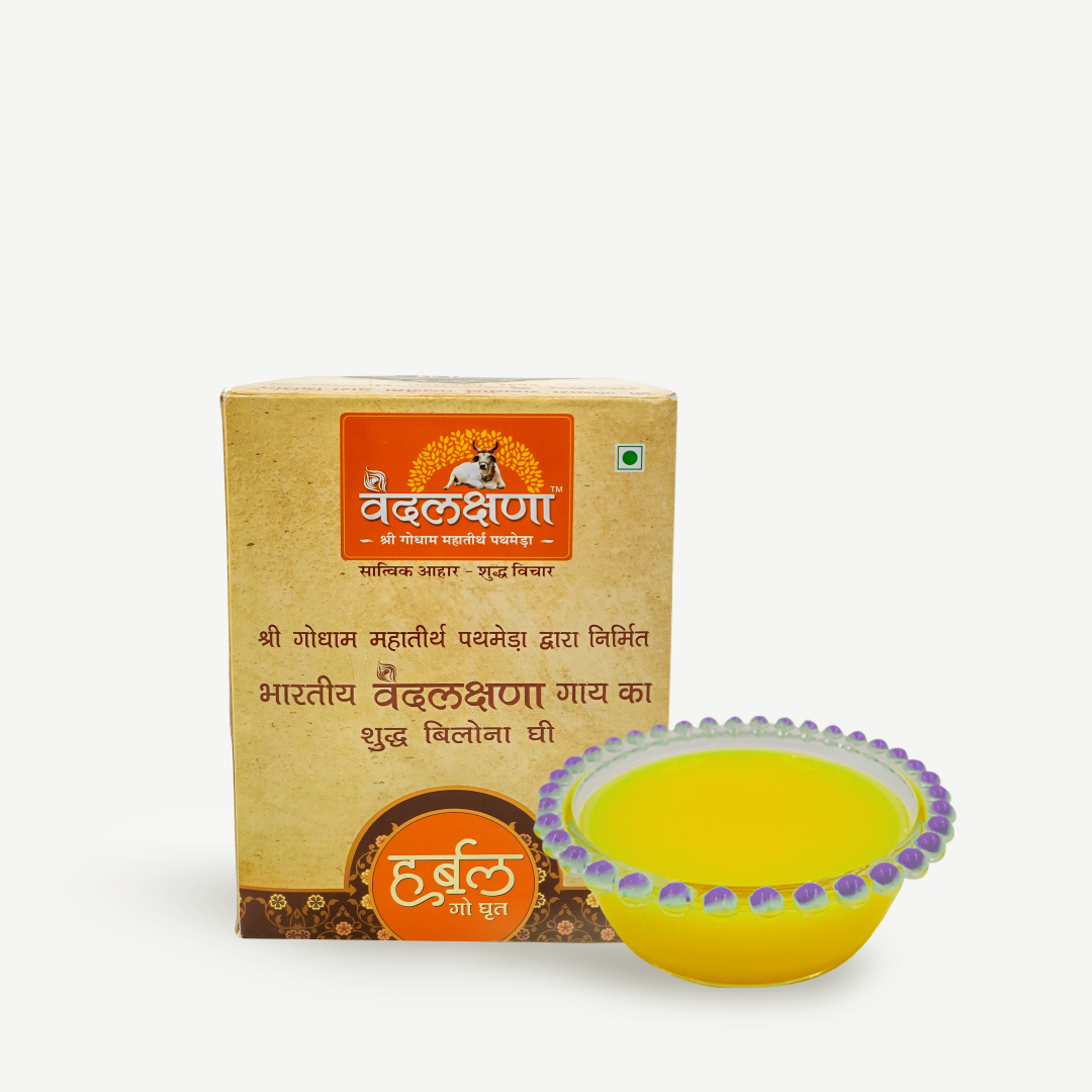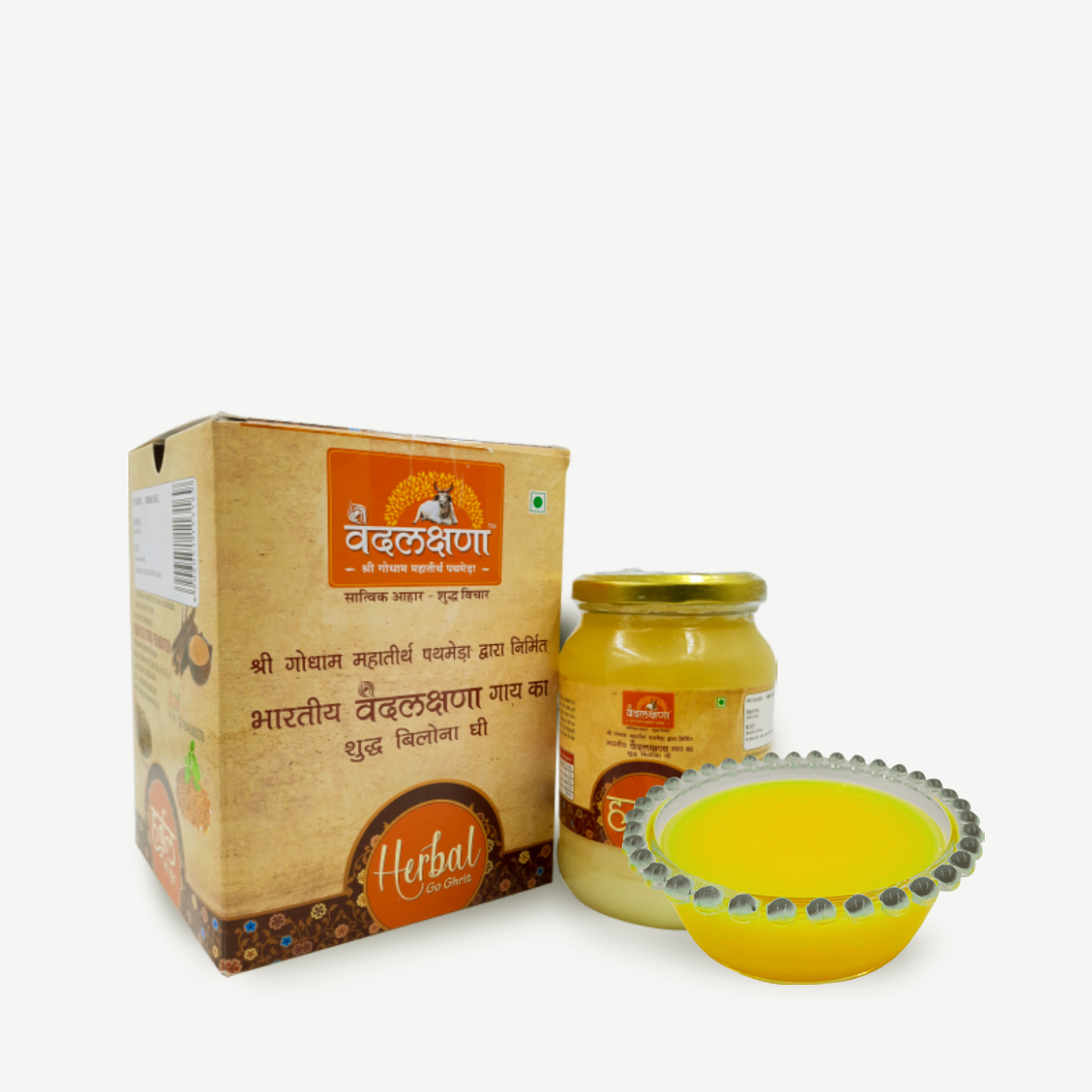Our Desi Herbal Bilona Ghrit is made using traditional methods. Hand-picked gaushala provide fresh and pure cow milk, preserved before being converted into curd. The curd is then slowly churned clockwise & anti-clockwise to produce butter, which is subsequently heated to produce the highest quality pure cow ghee. This Vedic Herbal Ghrit contains Asparagus, Ashwagandha, Mulethi, Fenugreek, Turmeric, Ajwain, etc. thats aids in the lubrication of joints, is beneficial to ones health related to the musculoskeletal disorder, bile, and cough. The best to take is to mix it with warm milk and drink it.