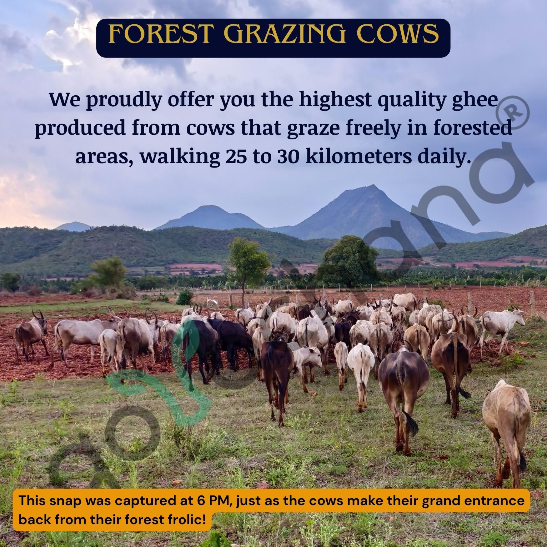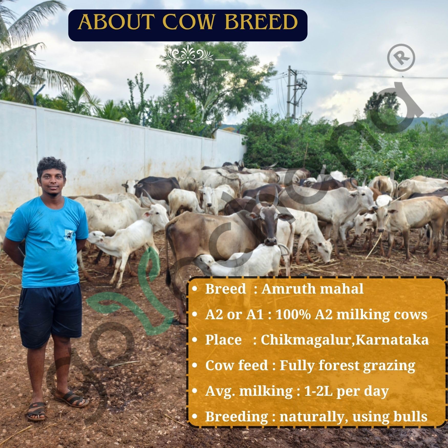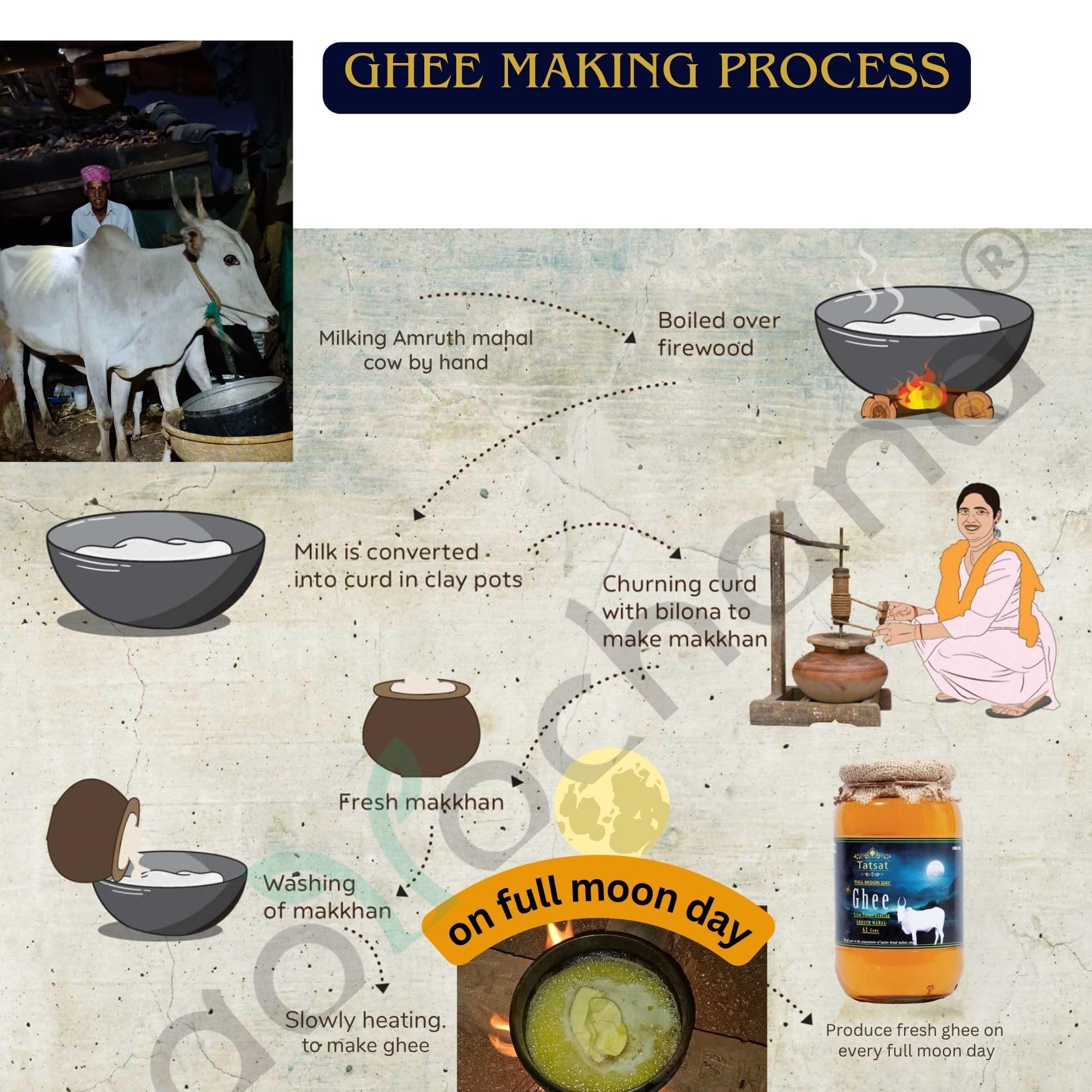 Our Ghee is prepared on the auspicious Full Moon day from the Ahimsa milk obtained from mountain breed "AMRUTH MAHAL" cows.