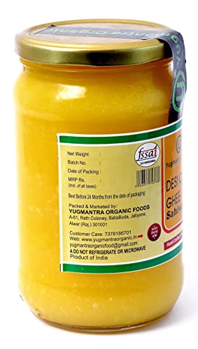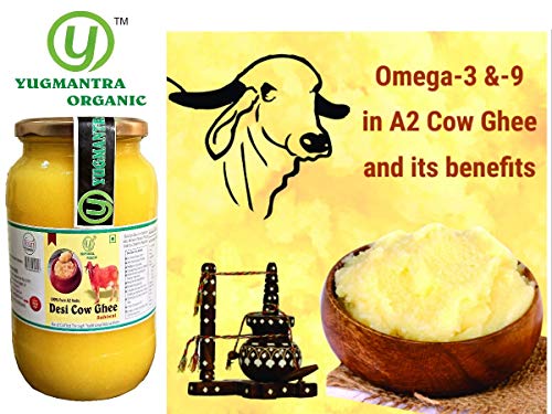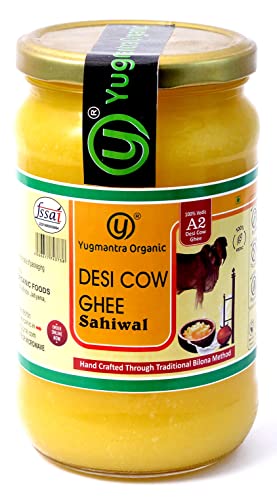 Yugmantra Organic Foods Pure Natural A2 Milk Shudh Desi Sahiwal Cow's Ghee from Alwar Traditional Vedic Method of Bilona to Produce Desi Ghee: Milk-Curd-Churn Curd in Clay Pots-Extract Butter-Heat the Butter-Granulated Yellow Cow Ghee is produced We believe it to be excellent for growing kids Power house of Vitamins that promotes good health and is super rich in anti-oxidants to improve body immunity.