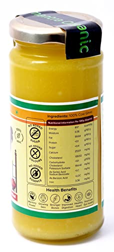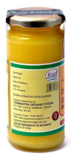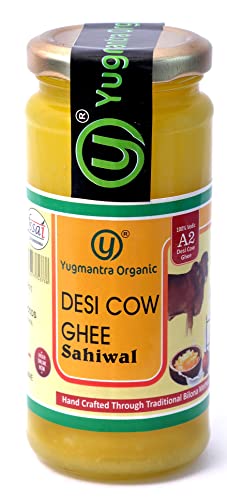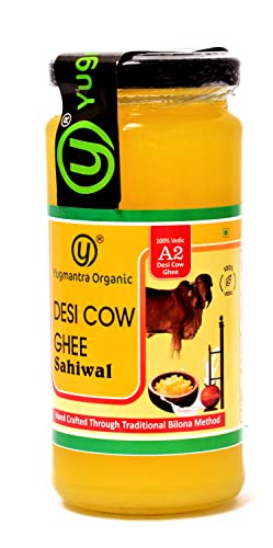 Yugmantra Organic Foods Pure Natural A2 Milk Shudh Desi Sahiwal Cow's Ghee from Alwar Traditional Vedic Method of Bilona to Produce Desi Ghee: Milk-Curd-Churn Curd in Clay Pots-Extract Butter-Heat the Butter-Granulated Yellow Cow Ghee is produced We believe it to be excellent for growing kids Power house of Vitamins that promotes good health and is super rich in anti-oxidants to improve body immunity.