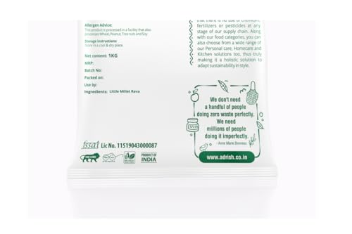 Adrish Zerowaste Organic Little Millet Rava (1000gm) - Unpolished Millet Suji | Stoneground Millet Rava Upma | Little Millet Upma Rava | High Plant Protein & Fiber
