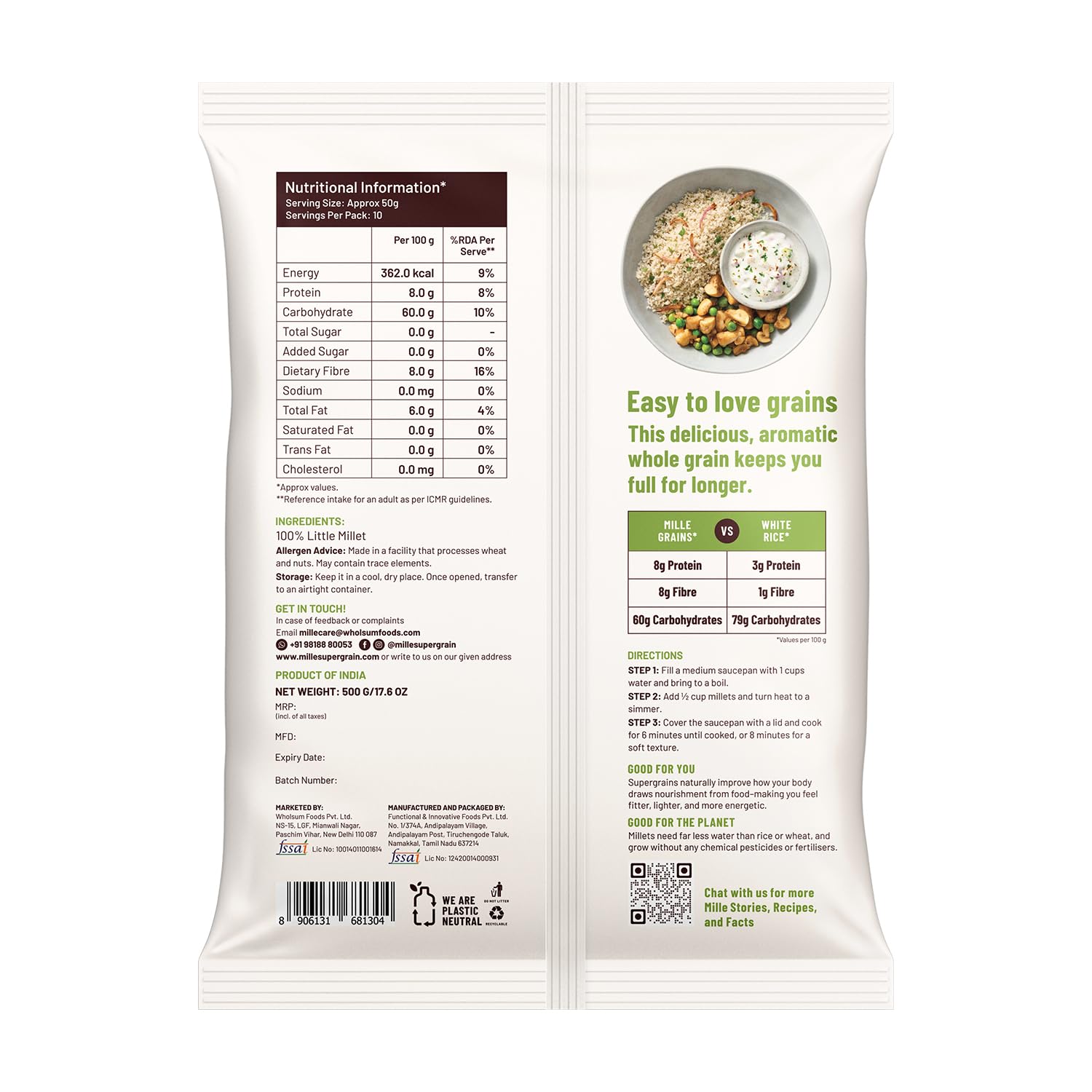 Mille Little Millet Whole Grain | Kutki/Samai/Same/Samulu | Ideal for Fasting | Unpolished Toasted No Soaking Required Gluten Free | High Plant Protein and Fibre | Sambar Rajma Dal Rice Replacement | Just cook for 6 minutes | High Grade Whole Grain 500 g