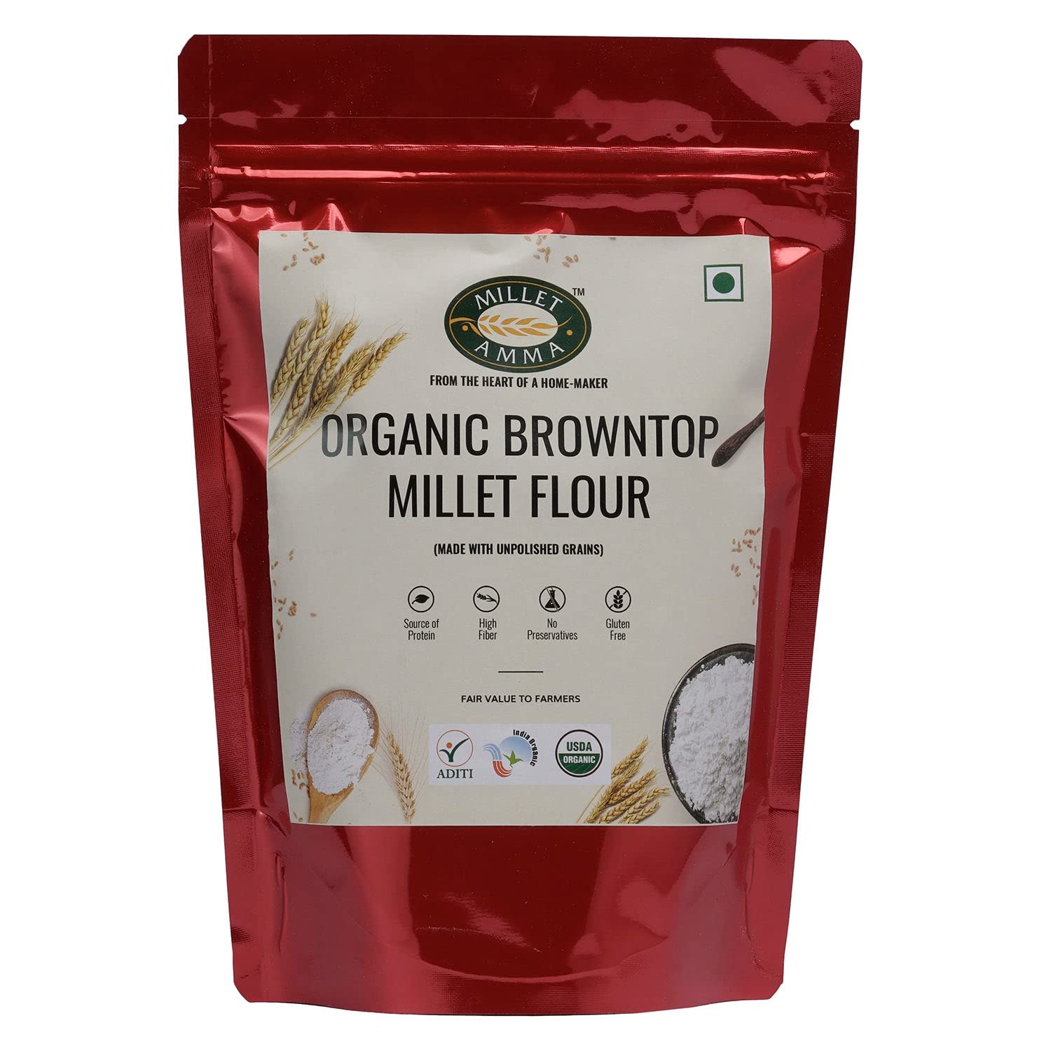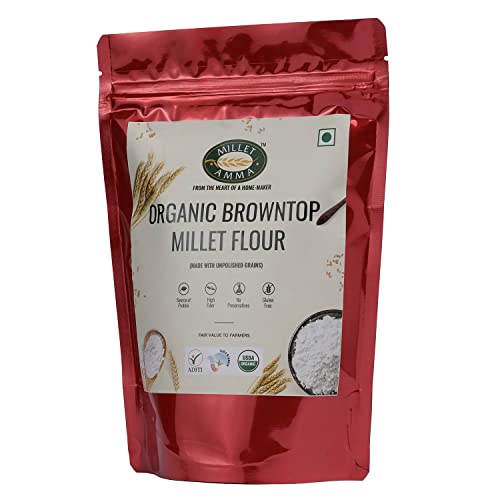 Millet Amma CERTIFIED ORGANIC Browntop Millet Flour - 1 Kg (500g x 2 Packs) 100% Vegan & Gluten Free Contains Unpolished Bajra Millet Suitable for Multiple Receipes ( Khichdi Idli Dosa Pancakes Cake and Rotis ) Rich in Magnesium