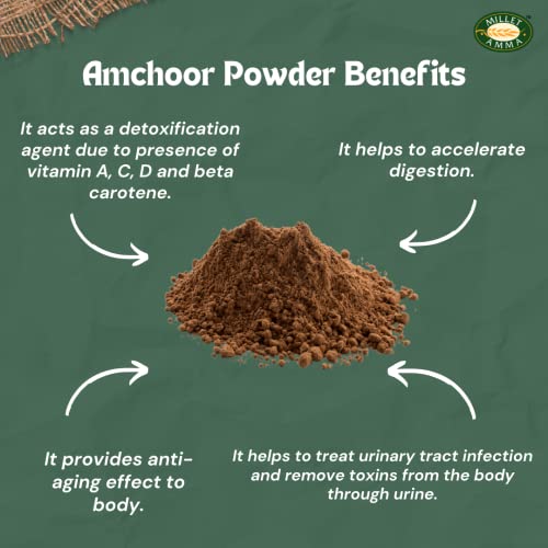 Milletamma's dry mango powder has high number of phenolic compounds that play a significant role in the prevention of many chronic diseases due to their antioxidant anti-inflammatory and anti-carcinogenic properties It helps to accelerate digestion. It acts as a detoxification agent due to presence of vitamin A C D and beta carotene. It helps to treat urinary tract infection and remove toxins from the body through urine. It provides anti-aging effect to body.