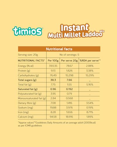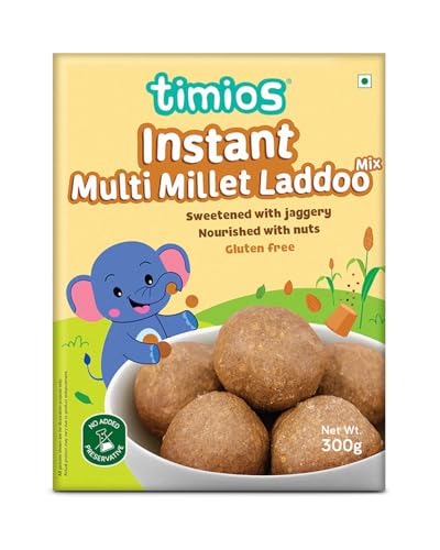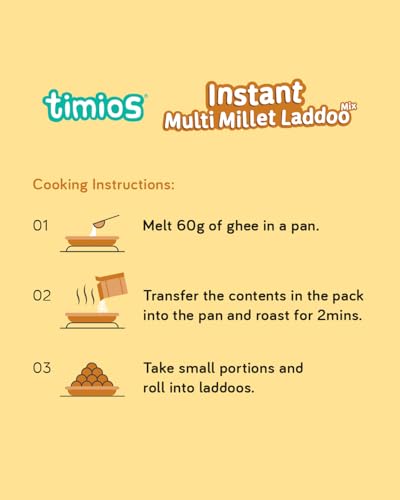 timios brings the pack of yummy instant ragi laddoo mix a perfect blend of nutrition and taste. Made with nutrient-rich ragi (finger millet) and naturally sweetened with jaggery these laddoos are a healthy treat for all ages. Packed with the goodness of roasted nuts they offer a rich source of protein healthy fats and fiber to fuel your day. Ragi is a powerhouse of calcium iron and fiber promoting bone health and aiding digestion. It promotes strong bones improves digestion and supports heart health. Ragi is also a low glycemic index food making it an excellent choice for maintaining healthy blood sugar levels. Jaggery A natural sweetener full of iron and minerals jaggery also provides a slow release of energy helping to maintain stamina and prevent energy crashes. It aids digestion detoxifies the body. Packed with healthy fats protein and vitamins nuts like almonds and cashews add a delicious crunch while offering heart-healthy omega-3 fatty acids antioxidants and minerals like magnesium. Enjoy the wholesome goodness of tradition packed with modern health benefits one bite of our Instant Ragi Laddoos and you'll experience the perfect blend of nourishment and taste!