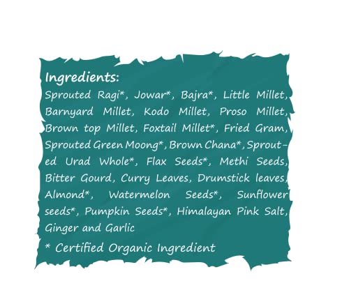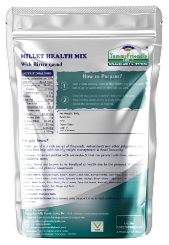 Tummy Friendly Foods Organic Health Mix With Bitter Gourd Methi Moringa and Curry Leaves 300g (100g each pack) | Organic Multigrain Health Mix Drink | Made of Cereals Millets Pulses Nuts & Seeds | Rich in Protein Iron Zinc Healthy Fat and Dietary Fiber No Chemical fortification Organic Multigrain Health Mix DrinkRich in Protein Iron Zinc Healthy Fat and Dietary Fiber. Made of Sprouted Ragi SPROUTS THE LIVING SUPER-FOOD ON THE PLANET. Sprouts are rich in Vitamins Minerals Fibre Anti-oxidants Enzymes Amino-acids and Essential Fatty Acids. When sprouted these little grains & pulses germinate into Baby plants. These Baby plants carry the all nutrients to grow into big plants. Easy to digest