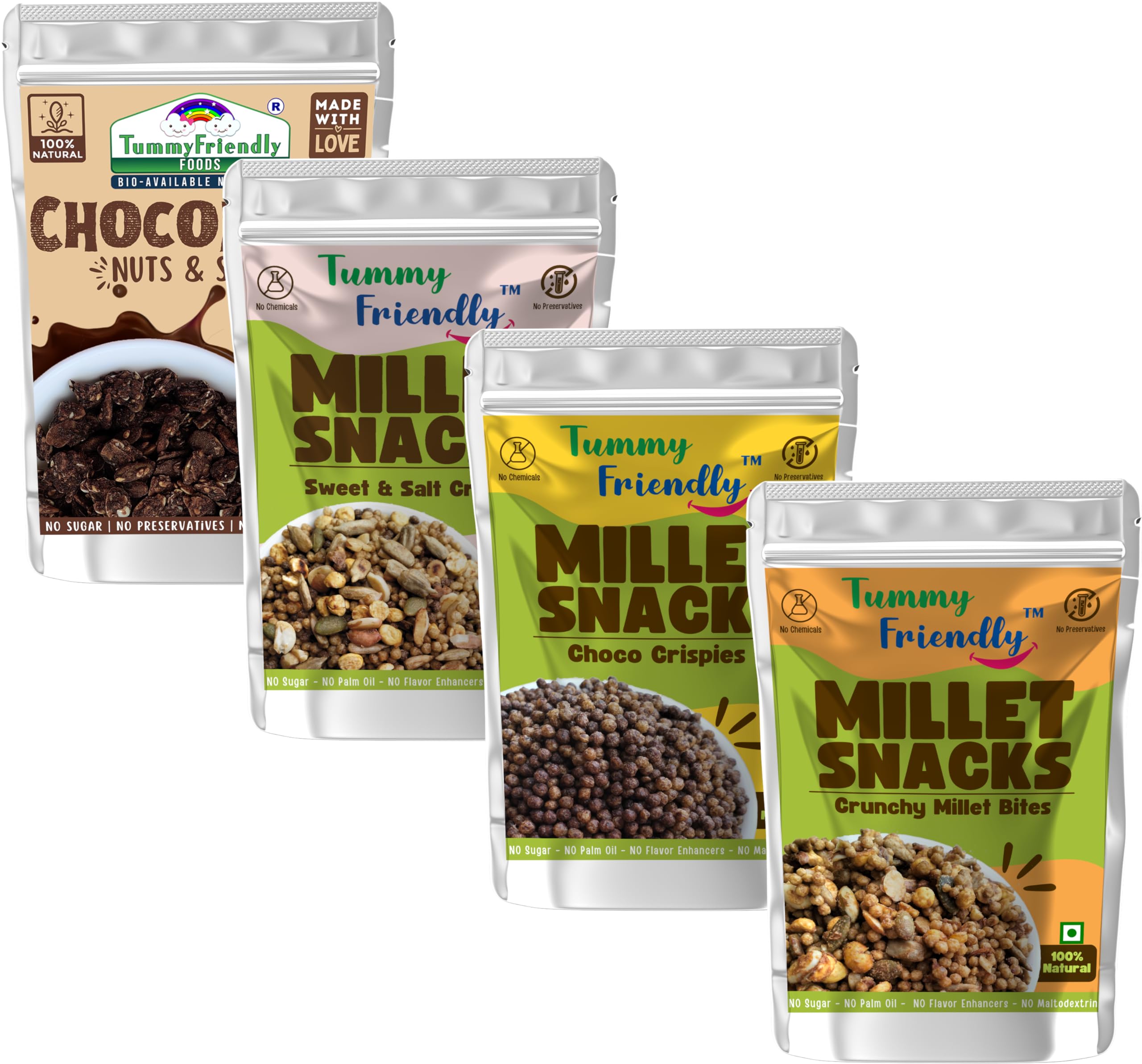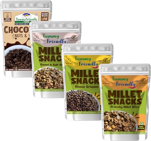 Tummy Friendly Millet Snacks for Kids Combo. Healthy Snacks for Kids, Toddlers, Adults. Travel friendly snacks for kids for school. Healthy Millet Snacks for Kids, adults. No Sugar, No Preservatives. 70g Each (ChocoCripsies-MilletBites-SweetnSalty-ChocoNu