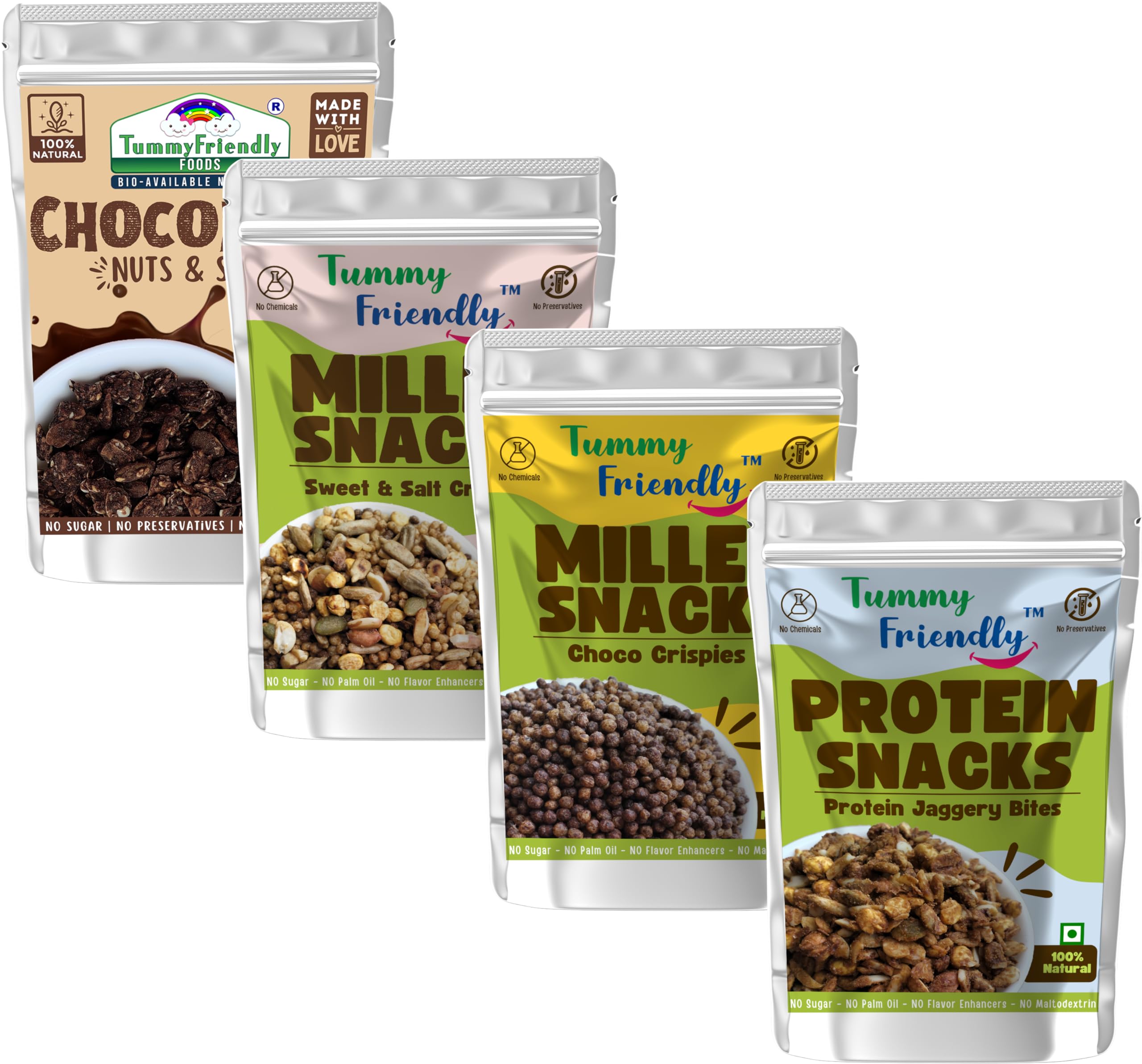 Tummy Friendly Millet Snacks for Kids Combo. Healthy Snacks for Kids, Toddlers, Adults. Travel friendly snacks for kids for school. Healthy Millet Snacks for Kids, adults. No Sugar, No Preservatives. 70g Each (ChocoCripsies-ProteinBites-SweetnSalty-ChocoN