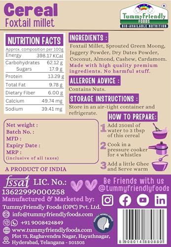 TummyFriendly Foods Foxtail Millet Cereal for baby Toddler kids 2 year old | Baby food for 2+ year old | Maximum Nutrition From Real Food. Available in Trial Baby Packs too. 100g. Introducing our Organic Multi Grain Health Mix Powder - the ultimate health drink for kids! Crafted with care and packed with goodness this nutritious blend is specially formulated to provide essential nutrients for growing children. Say goodbye to sugar worries! Our health drink for kids without sugar offers a healthy option for parents seeking wholesome alternatives. Made with natural ingredients it's a deliciously healthy choice that kids will love. Created with the well-being of children in mind our health mix for kids is homemade with love. We understand the importance of nourishing your little ones with the best which is why our blend is free from artificial additives and preservatives. Suitable for ages 2-6 years our health mix for kids malt is designed to support their growth and development. With a rich combination of grains it's a powerhouse of nutrients that helps fuel their active lifestyles. Looking for a Healthy Milk Mix powder for kids? Look no further! Our Health mix for kids is the perfect solution. Packed with vitamins and minerals it's an easy and convenient way to ensure your child gets their daily dose of goodness. Make the switch to our Organic Multi Grain Health Mix Powder today and give your kids the gift of health and vitality. With every sip they'll be nourished energized and ready to take on the world!