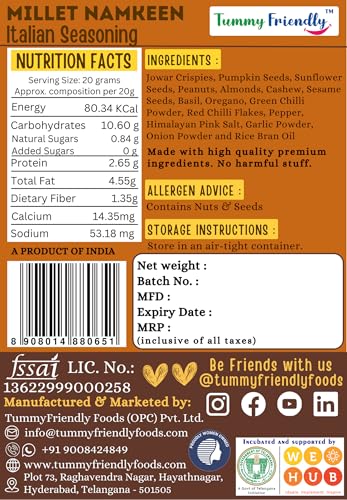 TummyFriendly Millet Namkeen Mixture for Kids and Adults.Healthy Snacks Items Namkeen for Kids, Adults, Pregnant Women, Diabetics. Healthy Snacks for Diabetics. No Chemicals, No Preservatives - Millet Snacks Pack of 2, 70g. Each (Desi, Italian-2X70)