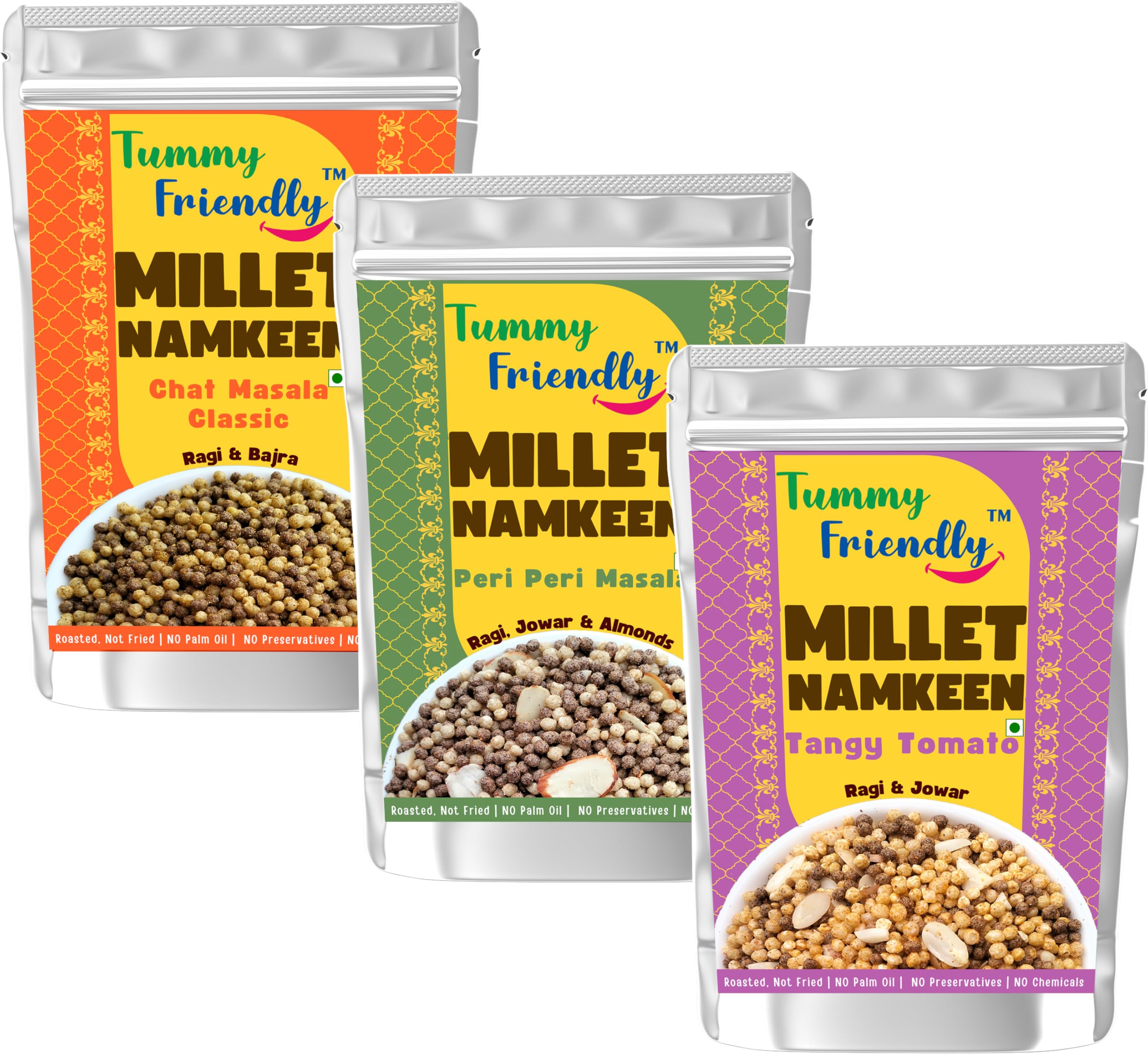 TummyFriendly Millet Namkeen Mixture for Kids and Adults.Healthy Snacks Items Namkeen for Kids, Adults, Pregnant Women, Diabetics. Healthy Snacks for Diabetics. No Chemicals, No Preservatives - Millet Snacks Assorted Combo Pack, 3 Packs, 70g Each (Chat, P