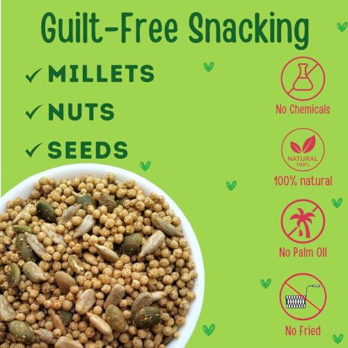 Introducing Healthy Millet Snacks â the perfect combination of taste and nutrition crafted for all ages! Made from 100% roasted millet our snacks are a wholesome alternative to traditional chips and namkeen. Whether you're looking for millet snacks for kids healthy options for adults or a snacks combo pack for the whole family these delicious bites are ideal for everyone. No Chemicals No Preservatives. Key Features: Healthy snacks for kids & adults packed with fiber and nutrients. Ready-to-eat millet snacks for busy days tea-time or as a light meal. A guilt-free crunchy chips replacement for health-conscious individuals. Suitable as snacks for diabetic patients pregnant women or those on a weight-loss journey. Available in snacks combo packs and as a thoughtful snacks gift. Versatile options like millet namkeen and millet snacks healthy to suit every occasion. Upgrade your snacking habits with our millet snacks healthy range â a delightful nutritious treat for all!