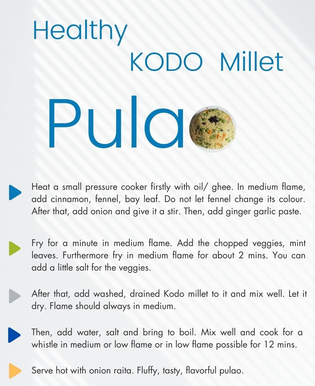Kodo Millet an ancient grain is gaining attention for its nutritional benefits over rice. It grows well in dry areas and packs more fiber protein iron and calcium than rice. Plus it's gluten-free and has a lower sugar impact making it great for digestion and diabetes management. Eating Kodo Millet can support heart health keep energy levels stable and aid in bone strength and muscle repair. And if you're watching your weight it's typically lower in calories than rice. So by making the switch you can enjoy a tastier healthier diet without sacrificing on flavor or nutrients. Cook it like Rice: Replace rice with Kodo Millet in your favorite dishes like biryani pulao or as a side dish. Cook it just like you would cook rice but with added nutritional benefits. Prepare Kodo Millet Upma: Saute chopped vegetables like carrots peas and onions add soaked and drained Kodo Millet and cook with spices for a delicious and filling upma.