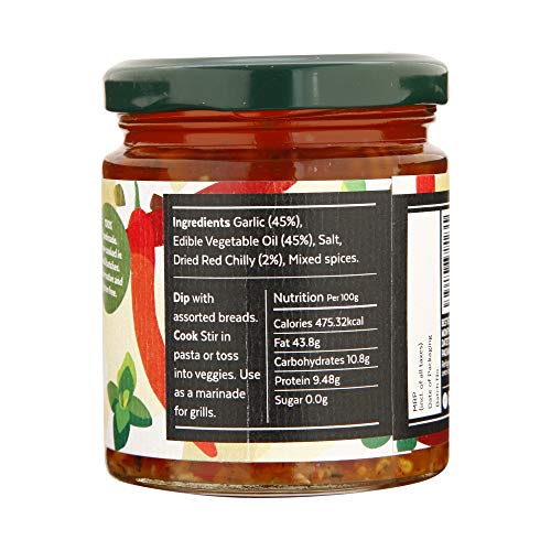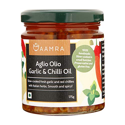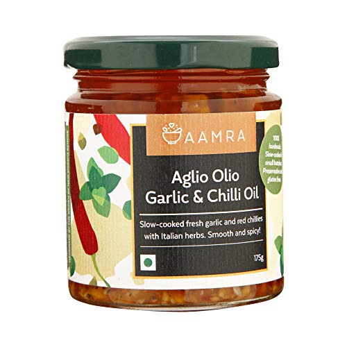 Aamra gourmet homemade aglio olio garlic & chilli oil 175 grams. Smooth & spicy | slow cooked fresh garlic & red chillies with Italian herbs. No artificial preservatives handmade slow-cooked toss up with pasta or vegetables serve as a dip with assorted breads or use as a marinade for grilling.