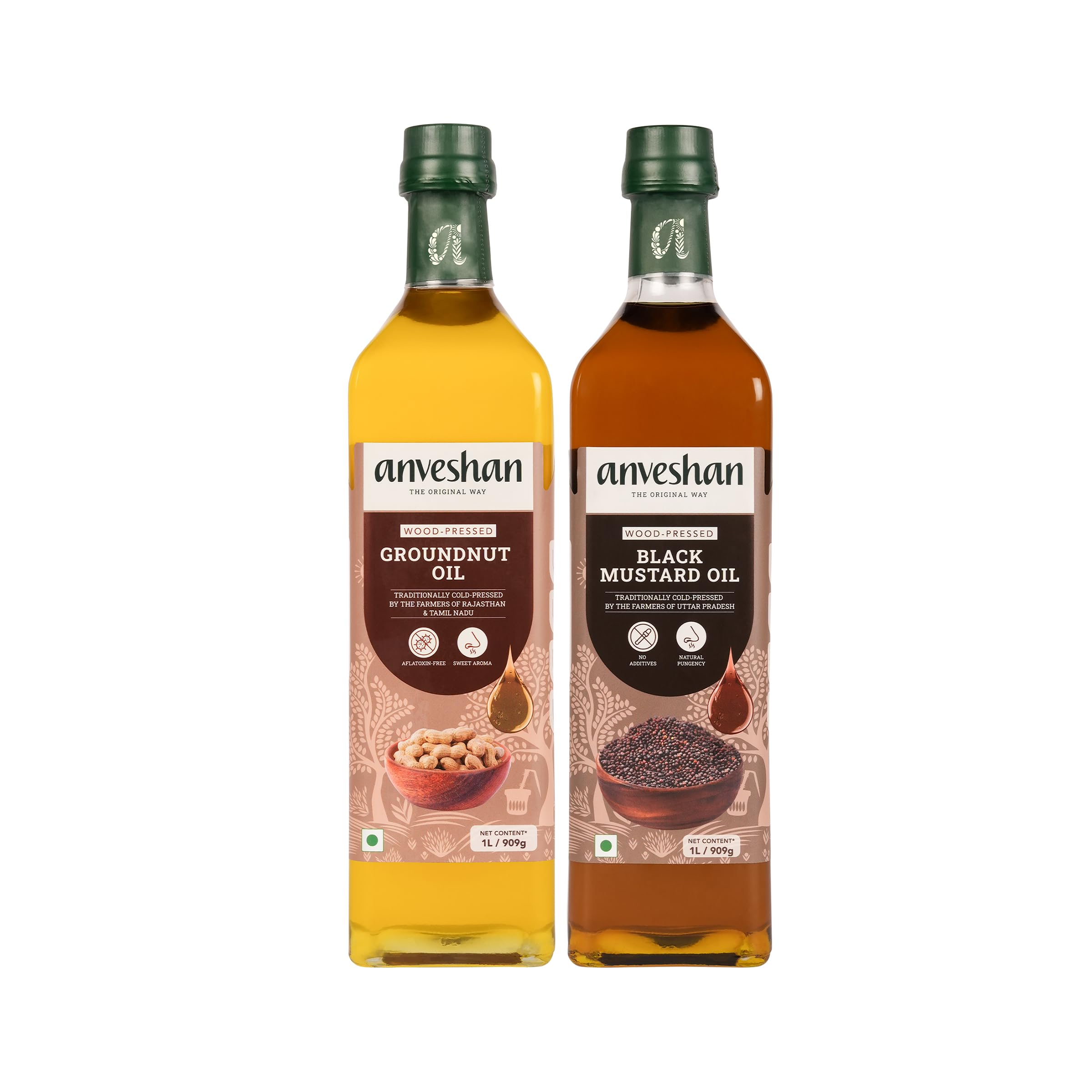 Anveshan Combo of Wood Pressed Black Mustard and Groundnut Oil - 1 Litre Each | Glass Bottles | Kolhu/ Kacchi Ghani/ Chekku | Natural | Chemical-Free