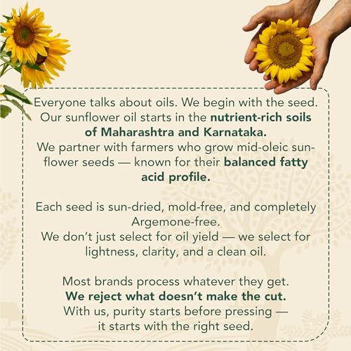 • WOOD PRESSED OIL: Our Wood Pressed Sunflower Oil is 100% pure vegan preservative-free chemical-free &. We Cold Press the sunflower seeds in wooden Kolhus at a low temperature. We use -press technology to ensure that the nutrients remain intact. Then we le