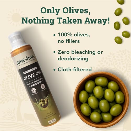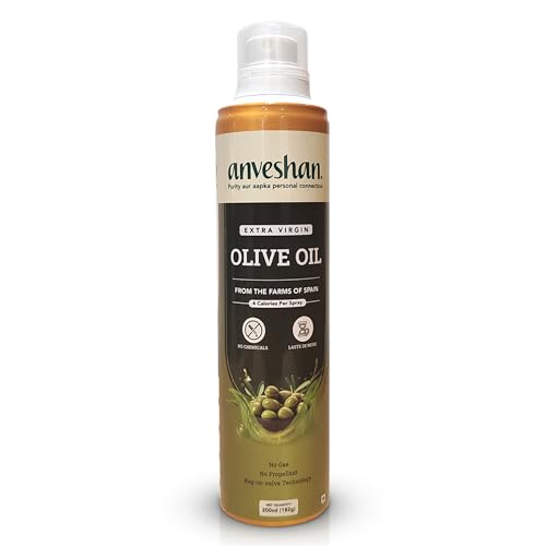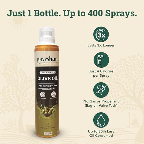 Anveshan Extra Virgin Olive Oil Cooking Spray - 200ml | Extra Virgin Cold Pressed Natural; Cook Healthy with 10X LESS Oil | Ideal for Dressing Baking Air-Frying | Good for Skin Hair & Massage