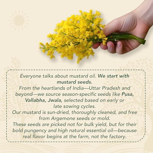 • FARM-FRESH MUSTARD SEEDS: Our farm-fresh mustard seeds are proudly grown in India. We traverse hundreds of kilometres and source our mustard seeds directly from the farmers of Bharatpur and Hathras region of Uttar Pradesh. We then let the seeds sun-dry fo