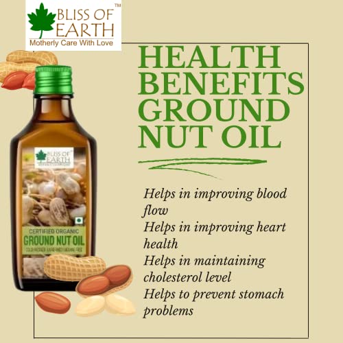Bliss of Earth Organic Groundnut Oil is extracted by cold pressing of groundnuts without using hexane. It is rich in nutrients vitamins and poly-unsaturated fats. It is also effective in decreasing cholesterol and good for hormonal activities. Like other plant-based oils groundnut oil contains no cholesterol. Groundnut oil is sometimes applied directly to the skin for joint pain dry skin and other skin conditions.