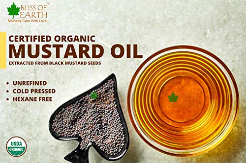 Bliss of Earth organic mustard oil is premium quality pure 100% natural unrefined virgin cold pressed mustard seed oil. It is free from chemicals and preservatives and is rich in Vit A & E calcium alpha omega-3 and alpha omega -6 fatty acid and anti oxidants which makes it an excellent hair vitalizer anti tan. Its antifungal antibacterial anti-inflammatory along with its healing and medicinal property which are highly beneficial for hair skin and body. For Smoother Face: It removes pimples and smoothens facial skin. Mix it with Bliss of Earth organic extra virgin coconut oil and massage your face for 5 minutes and then wipe with wet cotton cloth. For Long & Lustrous Hair: It is packed with vitamins and minerals particularly a high amount of beta-carotene which promote hair. It prevents scalp infection. Mix mustard oil with organic coconut and bliss of earth natural almond oil and warm it and massage hair for 15 minutes and then wash after 3 hours. For dark black hair: It is very effective in darkens your hair naturally. Apply the oil directly to your hair. Keep it there for half an hour and wash it off using Bliss of Earth Witch Hazel shampoo. For cracked Heels and Brittle Nails: It smoothens heels and strengthen nails. Mix candle wax with mustard oil and fill your cracked heel with this mixture and sleep with cotton socks. Apply it over nails to lubricate the nail bed. For Baby Massage: It is good oil for massaging babies. It improves blood circulation and helps in muscle and bone growth. Take a little oil and warm it a bit. Take the warm oil in your palms and gently massage babyâs body