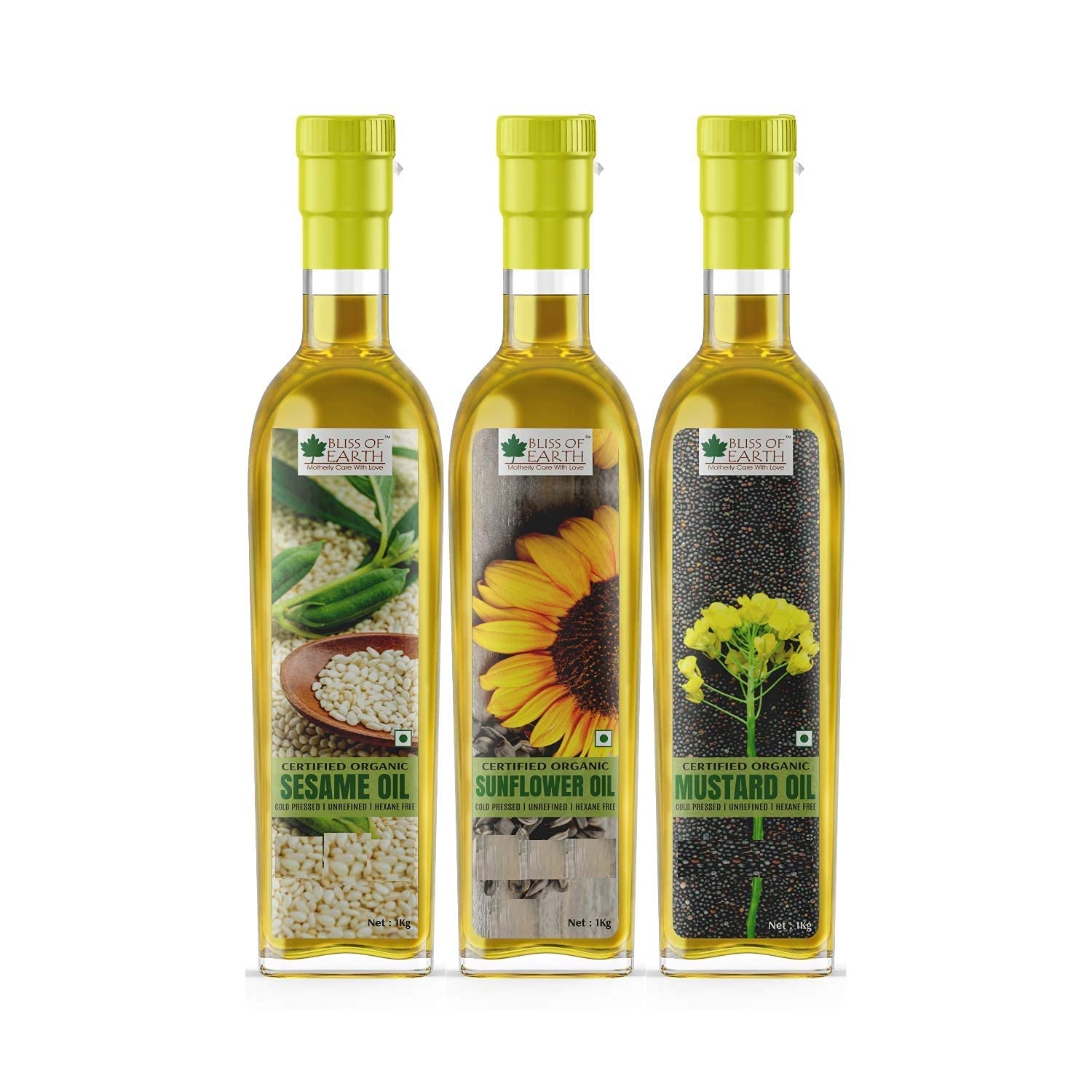 Bliss of Earth Combo Of Organic Mustard Oil, Sunflower Oil And Sesame Oil Cold Pressed For Cooking (1 Ltr Each) Pack Of 3