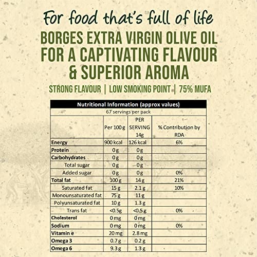In the Mediterranean like in other cultures there are some flavors that go beyond the palate and reach our minds in the form of pleasure. In Borges we work to identify those extraordinary foods and deliver them to you so you can have fun creating and sharing healthy and delicious dishes. From a special selection of the highest quality olives cultivated under the Mediterranean sun with all their original taste and aroma. Obtained from Cold Pressing of Olives Borges Extra Virgin Olive Oil has an intense flavour and aroma and is an excellent healthier substitute to butter and ghee.