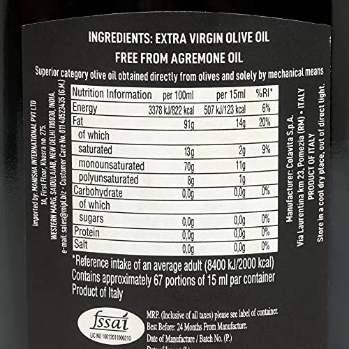 • 100% authentic Italian extra Virgin Olive Oil is made according to the Colavita family tradition. With CERMET seal ensuring it's 100% Italian and Quality management system certified ISO 9001