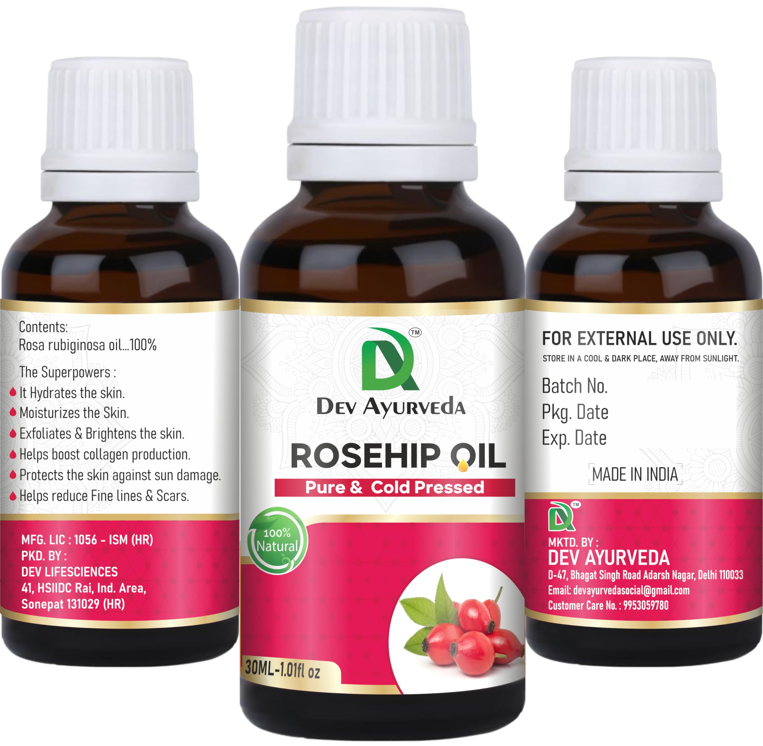 DAERVEDA Dev Ayurveda Cold Pressed Rosehip Oil 30 Ml. (1.01Fl. Oz) Pure & Natural