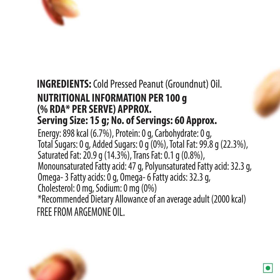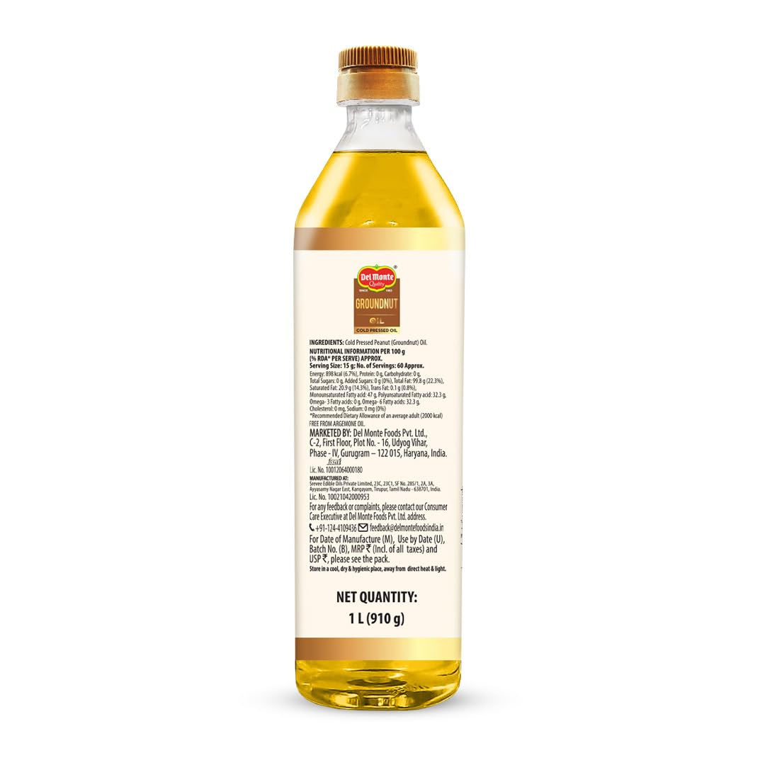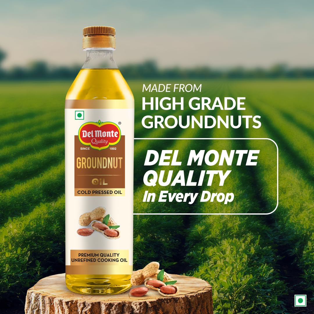 Del Monte Groundnut Oil is 100% pure and unrefined. It is made using premium quality groundnuts sourced locally. This oil is extracted using the cold-pressed method that helps preserve the essential nutrients and natural antioxidants found in the oil. Its subtly nutty flavour enhances the taste of your everyday food thus making it a perfect choice for regular Indian cooking.
