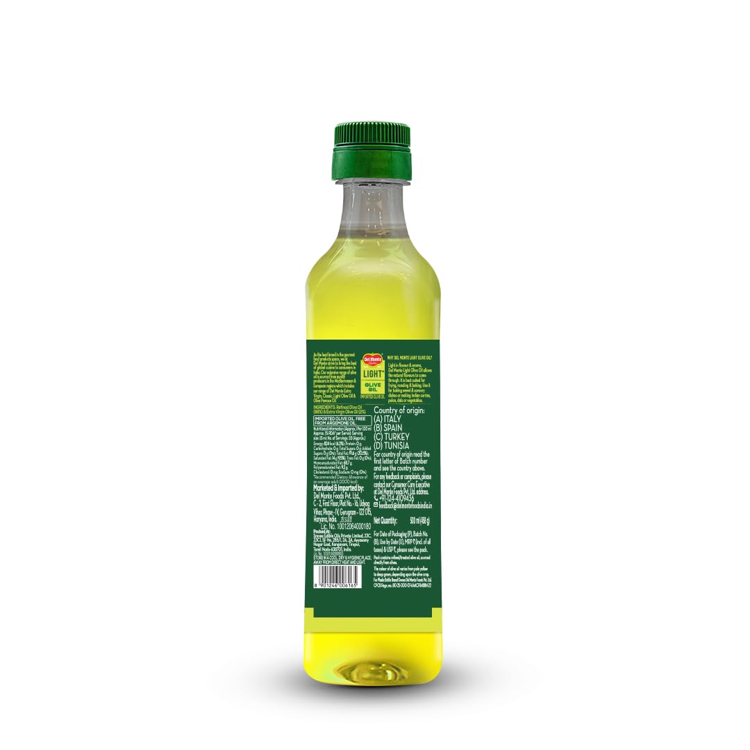 Del Monte Extra Light Olive Oil is distinguished by its light color and subtle taste. Has light flavor & aroma ensures minimal change in the taste of preparation. It is suitable for everyday Indian cooking- from making chapattis paranthas gravies to sauteing deep frying & baking. It preserves the natural flavour of food.