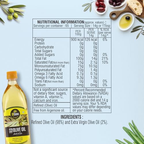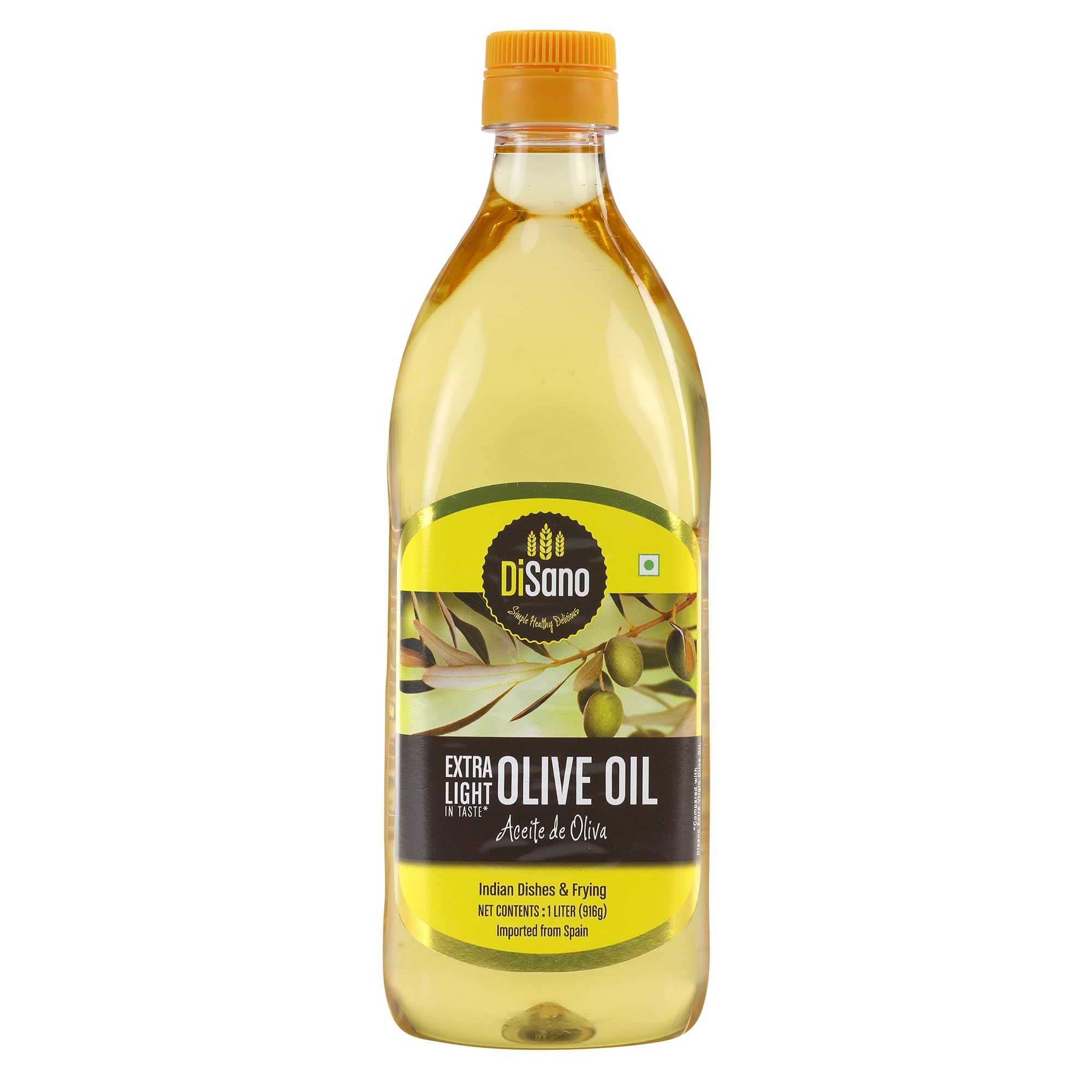 DiSano Extra Light Olive Oil is obtained from carefully selected high quality Olives. It has Extra Light taste and aroma hence is ideal for all Indian cooking specially for frying (Roasting ) Sautéing & Grilling Extra light flavour of Olives does not change the Original taste of Daily Indian cooking. It has a high smoking point which makes it ideal for deep frying. It gets absorbed less in food ensuring low intake of Oil Hence can be used to prepare all type of cuisine. Disano Extra Light olive oil can be a substitute to any regular oil in the kitchen.