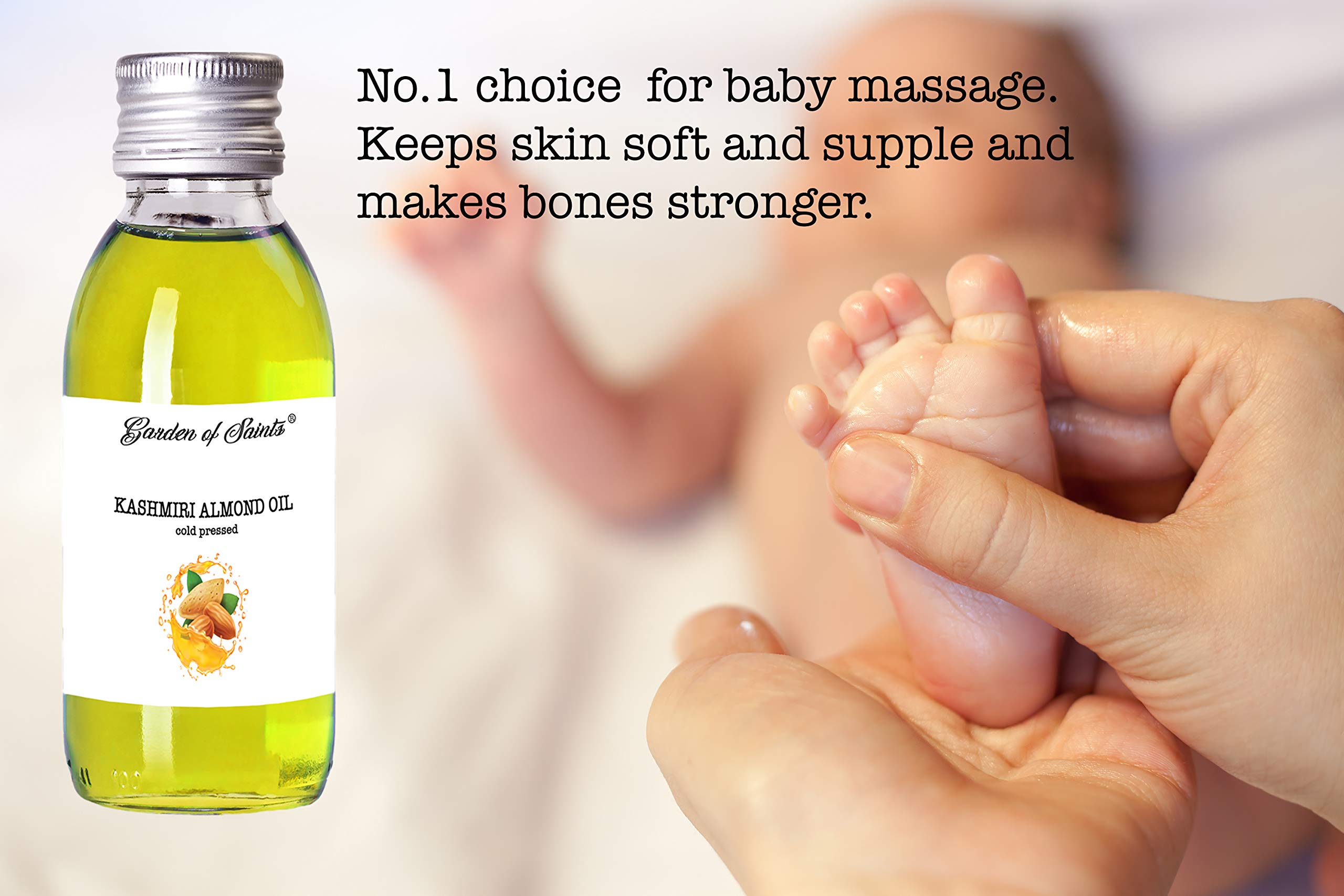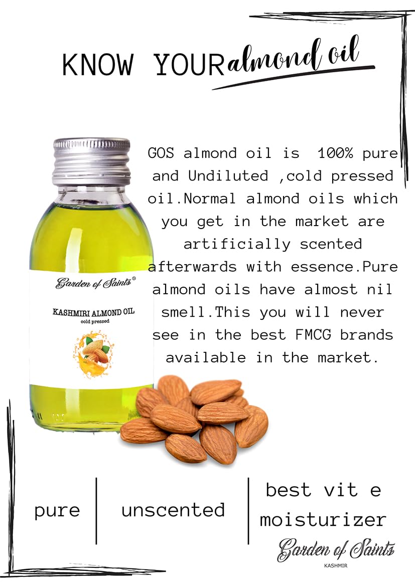 Garden of saints is a boutique brand from the valley engaged with local growers and farmers to bring you niche products straight from the farms without any artificial additives polishes and chemical preservatives. 1.Kashmiri almond oil is a wonderful all natural oil which has capabilities of penetrating deep into skin and hair tissues 2.Kashmiri almond oil is a great moisturizer for skin and hair and imparts an even tone to skin.3.Gos kashmiri almond oil is only cold pressed and theres no use of heat 4.It arrests frizziness in hair and adds deep shine 5.Wonderful under eye moisturizer and reduces fine lines and dark circles 6.Warm almond oil is a an excellent baby body massager 7.Cleanses skin declogs pores and avoids acne. 8.No chemicals parabens sulfates colors minerals or perfumes added. 9. Almond oil is a very light and less greasier oil compared to other type of oils10. Few drops of almond oil can also be added in milk and can be used as a laxative.