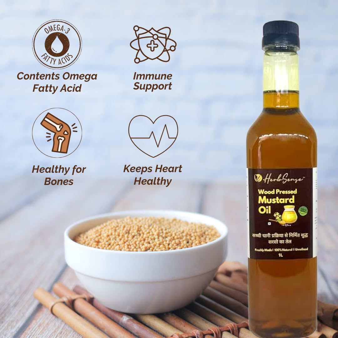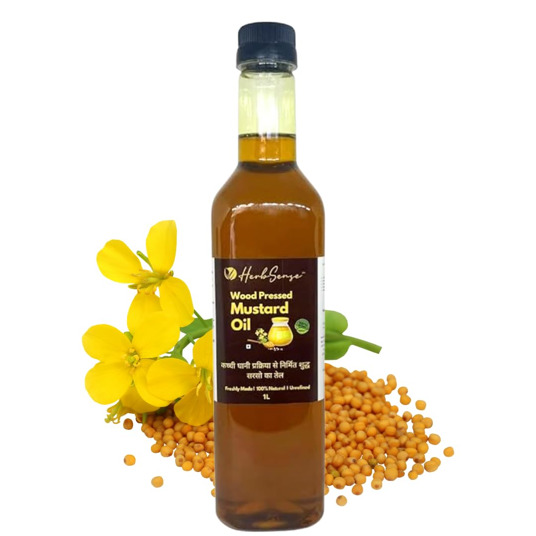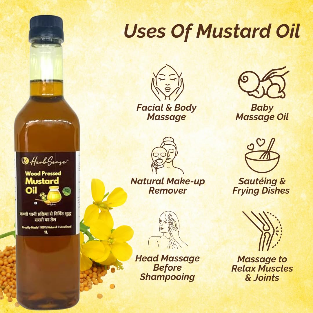Herbsense Wood Pressed Mustard Oil is 100% Pure Made in small batches with an aim of replacing refined oils in every Indian household by providing them with natural and real oil that is full of nutrients and beneficial for health. Wood Pressed Mustard Oil is the healthiest choice for stir-frying and making sabzi like bhindi gobi aloo and beans. Wood Pressed Mustard Oil is the healthiest choice for frying because it has a high point. Mustard Oil can be used to fry Samosa Pakoda etc.