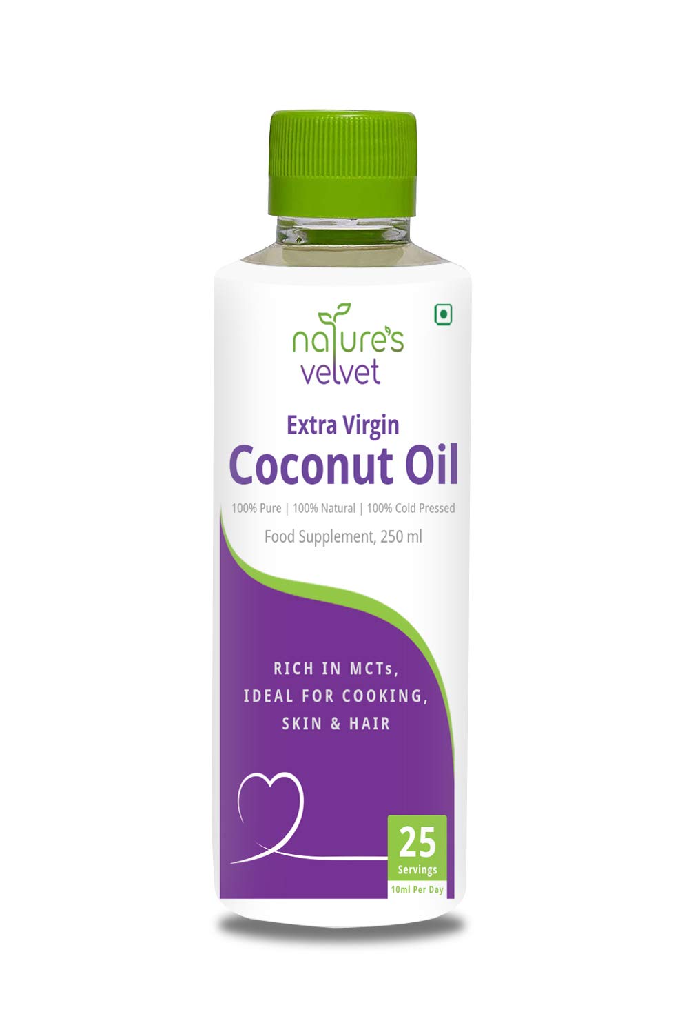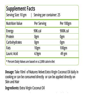 Nature's velvet extra virgin coconut oil boost immune system due to presence of lauric acid promotes heart health as it contains zero trans fat. It helps in weight loss as mcts raise metabolism and prevent accumulation of fats and instead converts it to energy naturally balances harmones helps in brain repair function as digestion of mcts by liver create ketones which are readily accessible for enegy and can be use for internal consumption & external applications.